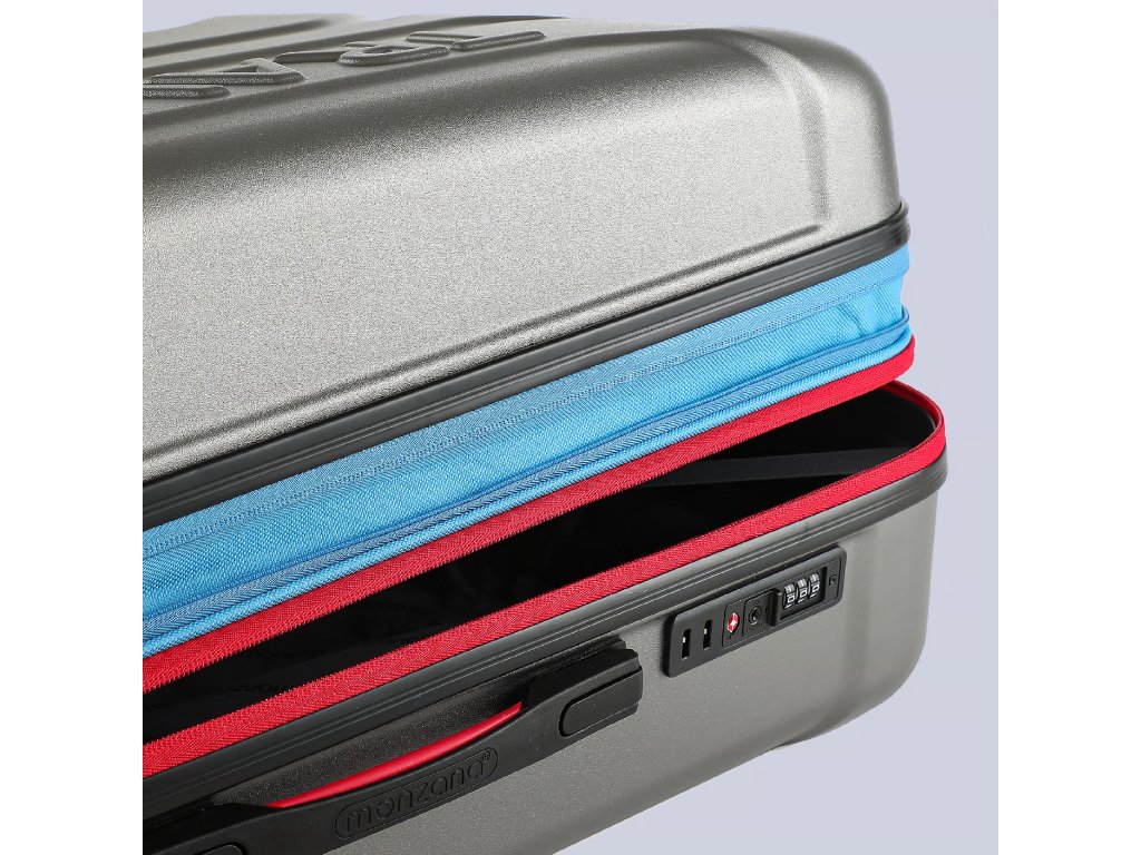 Ochranu osobných vecí zvyšuje integrovaný TSA zámok, ktorý je ideálny pri cestovaní do krajín s kontrolou batožiny. Každý kufor disponuje dvoma farebne odlíšenými zipsami: červený slúži na otvorenie kufra a modrý na rozšírenie objemu. Vo vnútri nájdete elastické popruhy a dodatočné vrecko upevnené suchým zipsom pre menšie predmety či dokumenty.