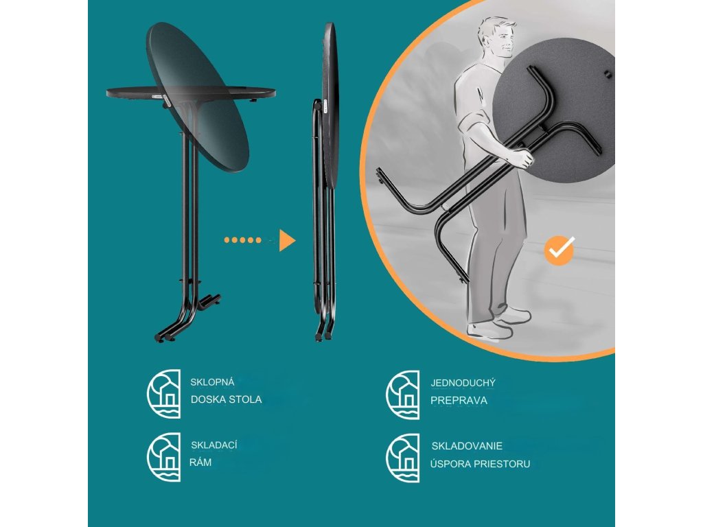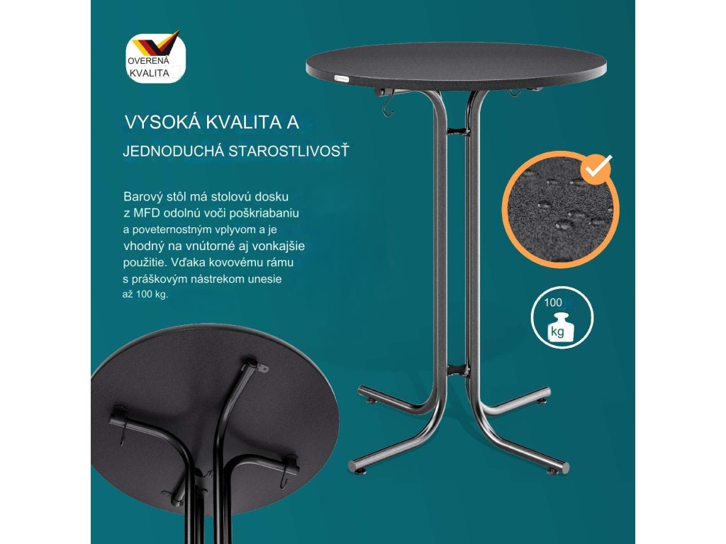 Rozkladací barový stôl môžete využiť na slávnostnú recepciu, záhradnú párty alebo romantickú svadbu, vďaka svojmu jednoduchému dizajnu. Hodí sa na všetky príležitosti. Skladacia okrúhla stolová doska s priemerom 80 cm ponúka dostatok miesta na nápoje, občerstvenie a dekorácie. Výškovo nastaviteľné nožičky vyrovnávajú nerovnosti podlahy a zaisťujú stabilitu. Stôl má stolovú dosku z MDF odolnú voči poškriabaniu a poveternostným vplyvom. S kovovým rámom s práškovým nástrekom unesie záhradný stôl až 100 kg. Barový stôl sa ľahko udržiava a jeho sklopná stolová doska s hrúbkou 1,8 cm je odolná voči UV žiareniu. Na okrúhlom barovom stolíku sú tiež 2 háčiky, na ktoré si môžete zavesiť bundu alebo tašku.