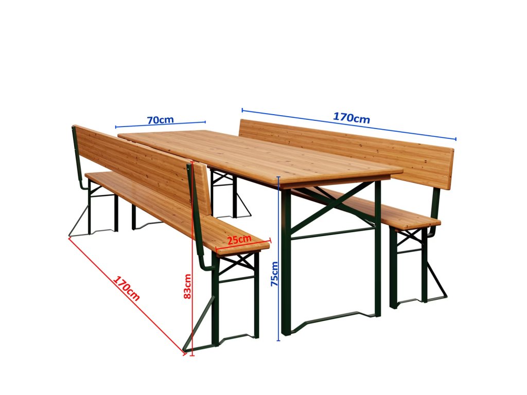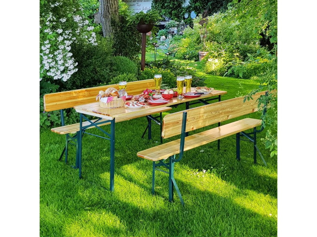 Pivný set ponúka komfortné posedenie až pre 8 osôb. Set obsahuje dve lavice s operadlami a extra široký stôl, vďaka čomu budete vždy pripravení na nečakané oslavy a spontánne stretnutia. Montáž aj demontáž sú jednoduché, stôl sa dá v strede zložiť, nohy lavíc aj stola sú sklopné, takže celý set možno ľahko uskladniť, keď ho práve nepotrebujete. Pevná oceľová konštrukcia s práškovým nástrekom zaručuje vysokú stabilitu, zatiaľ čo lazúrované drevo s ochranným lakom odoláva vlhkosti, čo z neho robí ideálnu voľbu pre vašu záhradu. Či už ide o narodeninovú oslavu, párty, klubové podujatie alebo inú spoločenskú akciu, s touto pevnou a praktickou súpravou ste vždy pripravení privítať väčší počet hostí.