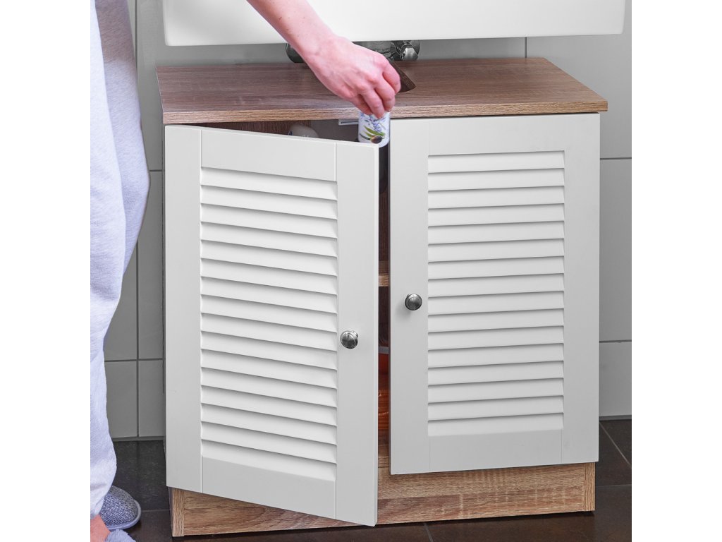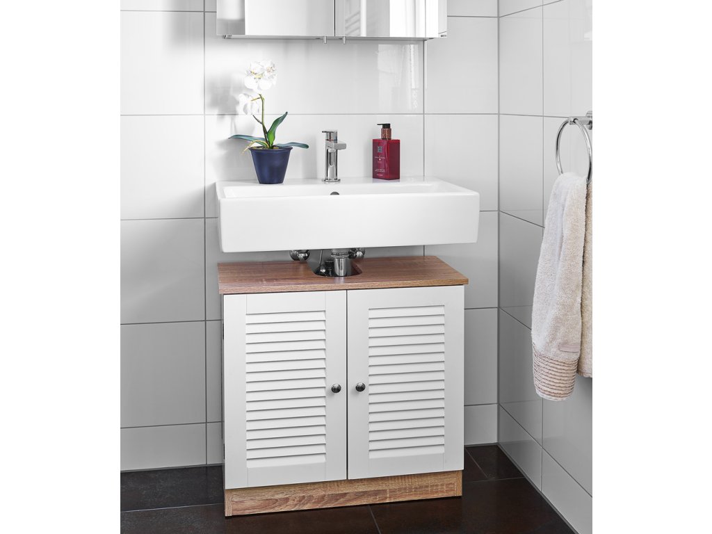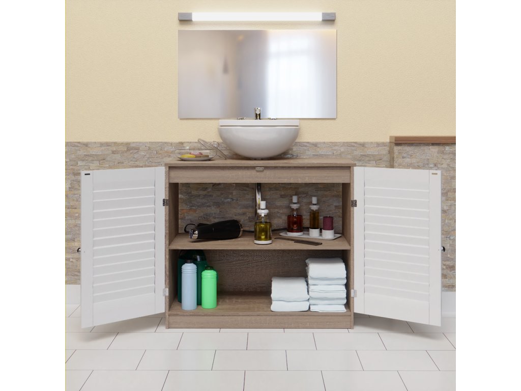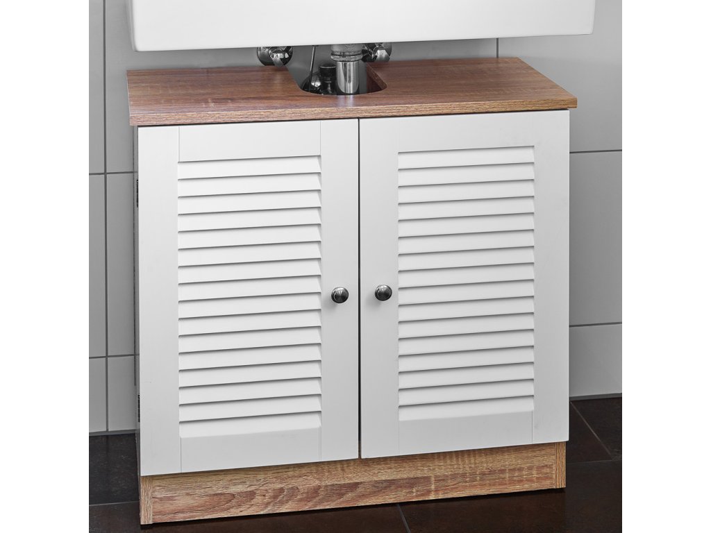 Priestranná skrinka pod umývadlo ponúka dostatok priestoru pre vaše uteráky, čistiace prostriedky a mnoho ďalších kúpeľňových doplnkov. Tradičná drevená a dyhovaná skrinka poskytne vašej kúpeľni stredomorský nádych. Táto efektívna skrinka pod umývadlá ušetrí veľa miesta a je dokonalým doplnkom vášho kúpeľňového nábytku.