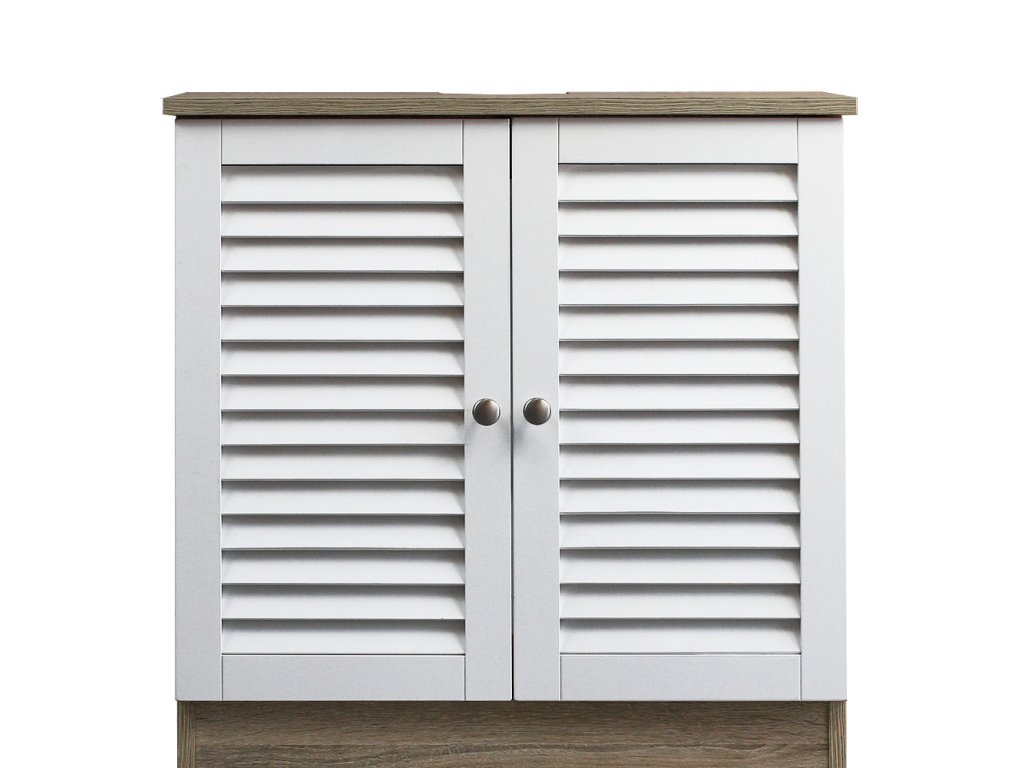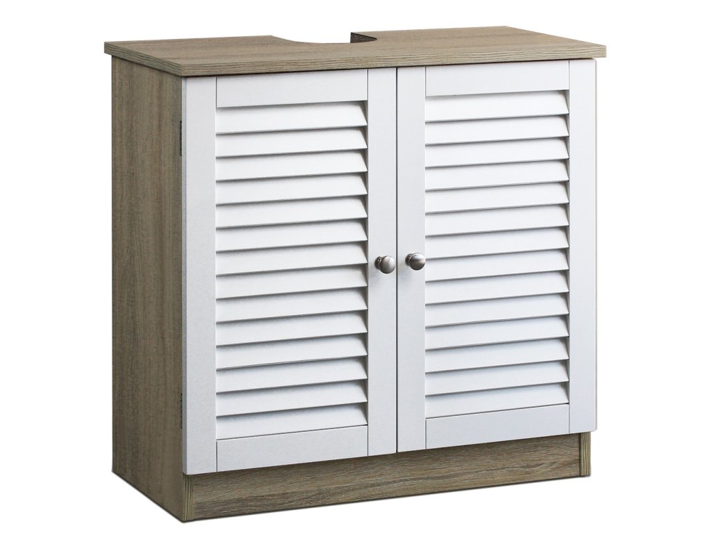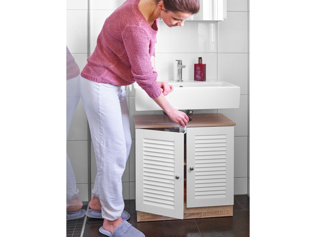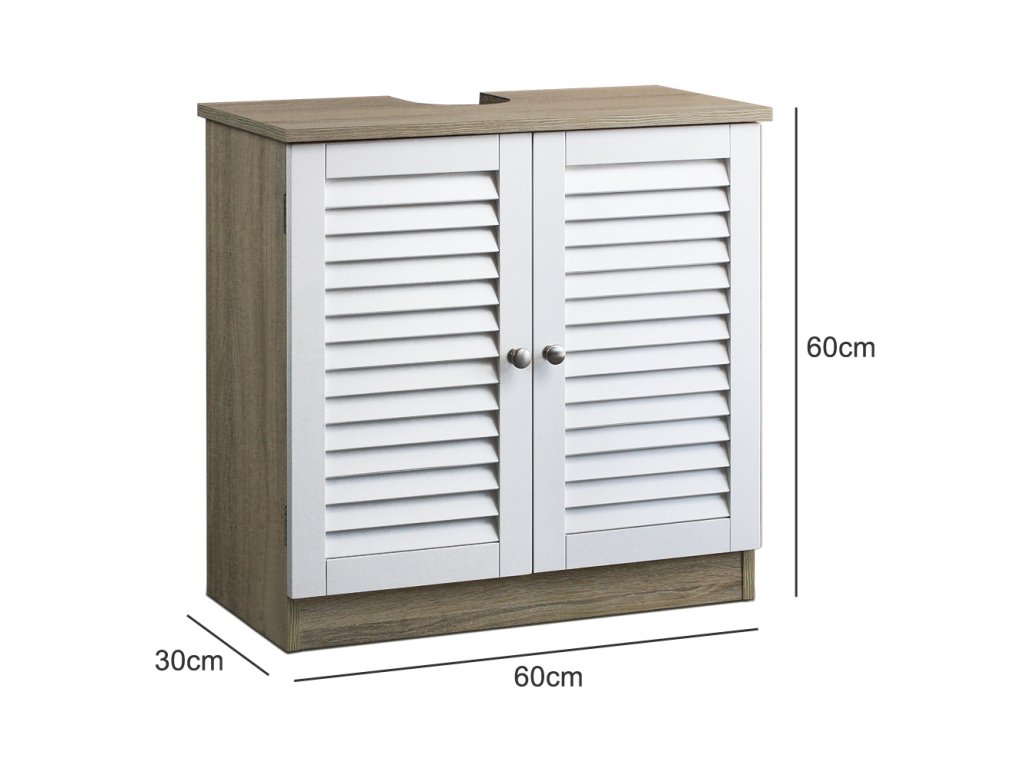 Priestranná skrinka pod umývadlo ponúka dostatok priestoru pre vaše uteráky, čistiace prostriedky a mnoho ďalších kúpeľňových doplnkov. Tradičná drevená a dyhovaná skrinka poskytne vašej kúpeľni stredomorský nádych. Táto efektívna skrinka pod umývadlá ušetrí veľa miesta a je dokonalým doplnkom vášho kúpeľňového nábytku.