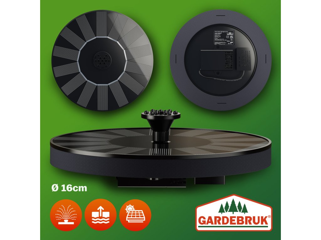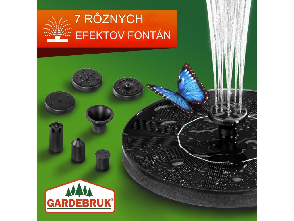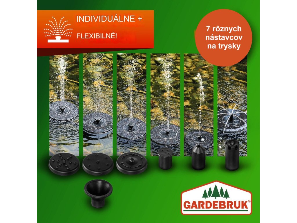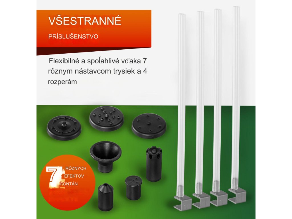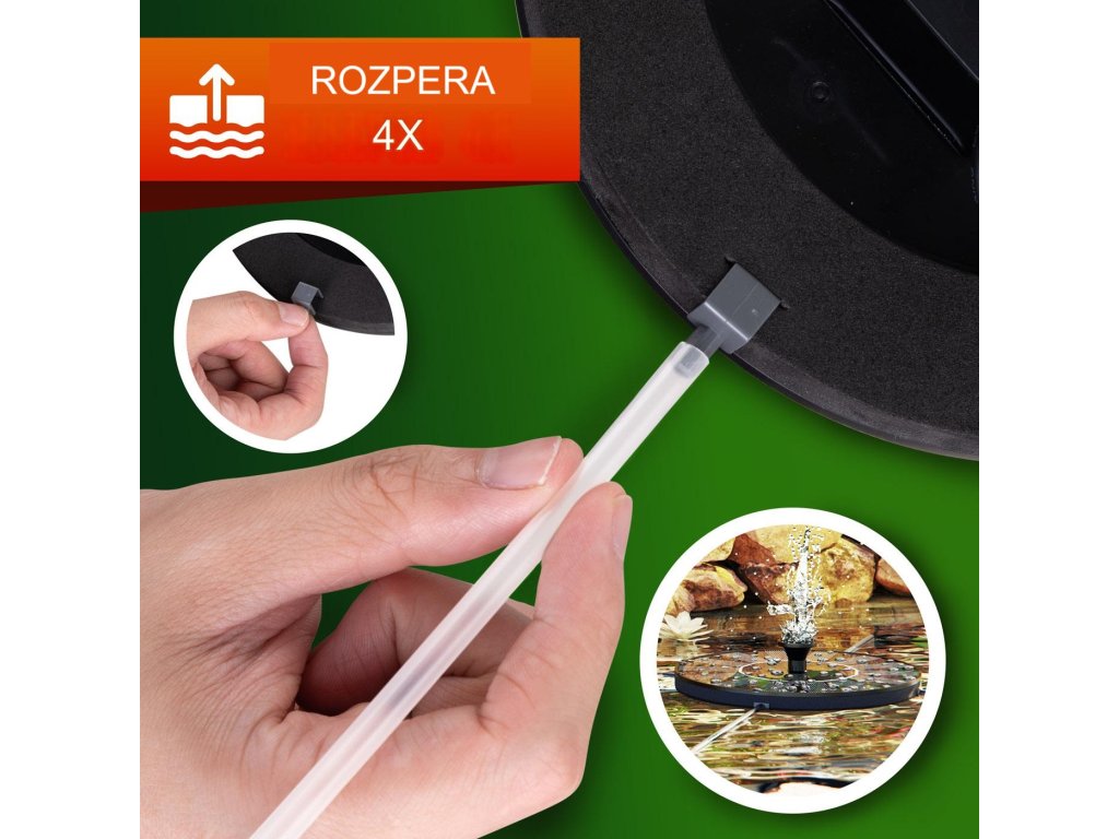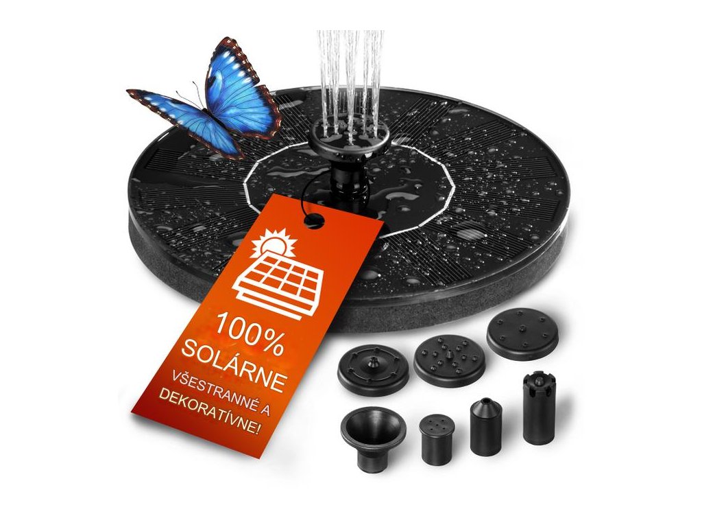 Solárna fontána je ideálna do každej záhrady. Okrúhly solárny panel pláva na hladine vody a zachytáva slnečnú energiu. V závislosti od vášho individuálneho vkusu môžete meniť typ fontány pomocou 7 rôznych tryskových nástavcov. Aby sa fontána neposunula príliš k okraju, 4 rozpery nenápadne zaistia stabilnú polohu. Monokryštalický solárny panel na svoju prevádzku nevyžaduje batériu ani externý zdroj napájania a má tiež veľmi vysokú účinnosť a dlhú životnosť. Čerpadlo je možné uviesť do prevádzky bez náradia. Fontánu jednoducho umiestnite do vody na slnko a automaticky sa spustí do niekoľkých sekúnd.