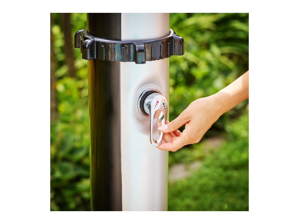 Pri optimálnom slnečnom svetle sa voda v sprche ohreje až na 60 °C bez potreby elektrickej energie. Stačí pripojiť záhradnú hadicu a môžete si užiť príjemnú sprchu. Vďaka chrómovanej jednopákovej batérie z kovu si môžete nastaviť teplotu vody podľa potreby. V spodnej časti sa nachádza dodatočný kohútik , ktorý umožní rýchly prístup k studenej vode. Stabilitu sprchy zaisťuje robustná plastová základňa, ktorá zabezpečuje pevné ukotvenie. Priestranná sprchová hlavica poskytuje osviežujúci prúd vody a vďaka integrovanému guľovému kĺbu ju môžete otáčať a nakláňať o 360° podľa potreby. Táto záhradná sprcha s objemom 35 litrov je vyrobená z UV odolného syntetického materiálu. Demontáž a preprava sú rýchle a jednoduché, pričom vypustenie vody umožňuje praktická vypúšťacia zátka.