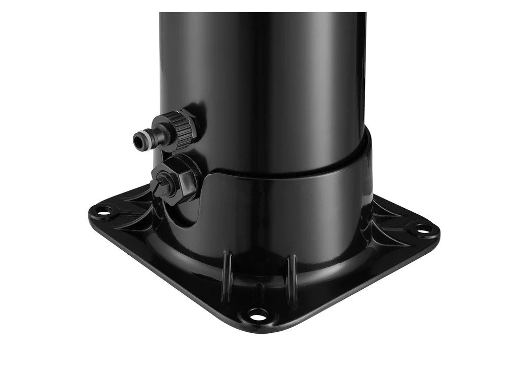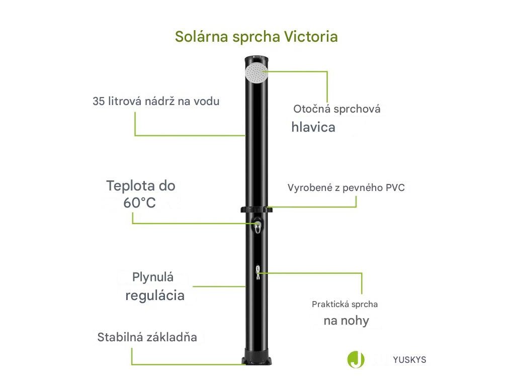 V spodnej časti sa nachádza dodatočná sprcha na nohy, ktorá očista pred vstupom do bazéna. Vďaka svojej výške je ideálna aj na plnenie vedier alebo polievacích kanví. Pevná základňa s PVC doskou s rozmermi 19,5 × 19,5 cm je bezpečne ukotvená do zeme pomocou štyroch skrutiek. Prívod vody je riešený jednoducho cez zariadenie na pripojenie bežnej záhradnej hadice. Solárna sprcha Victoria zaujme svojim minimalistickým vzhľadom v čiernom prevedení so striebornými kovovými detailmi.