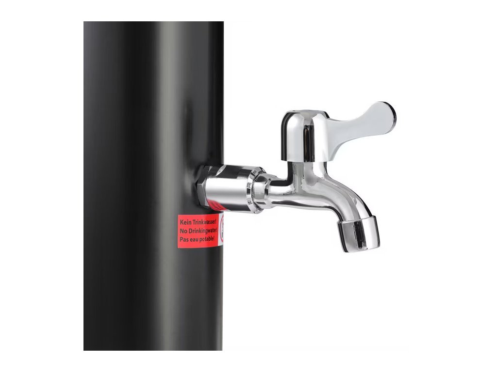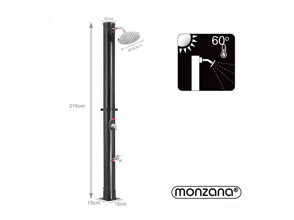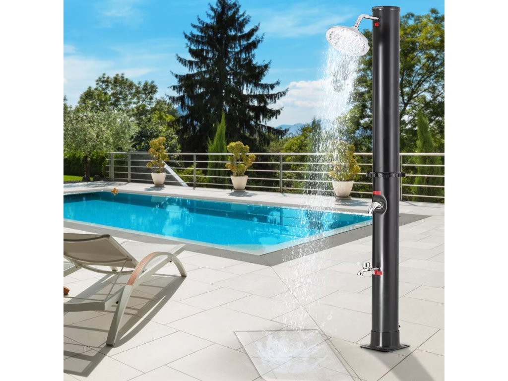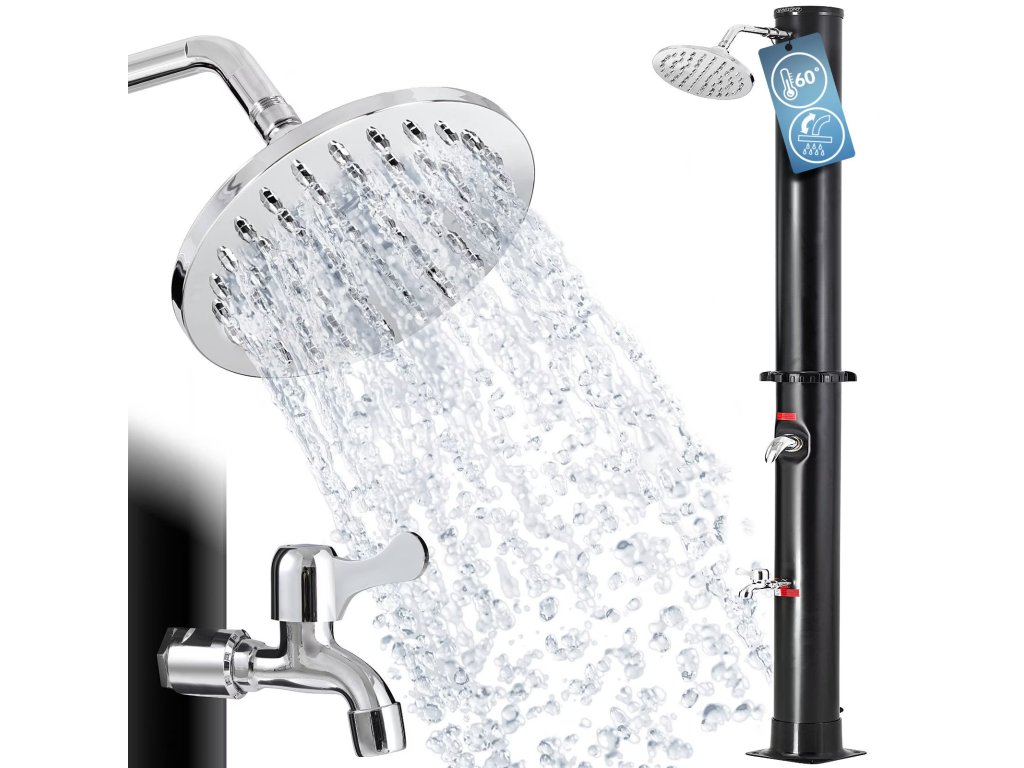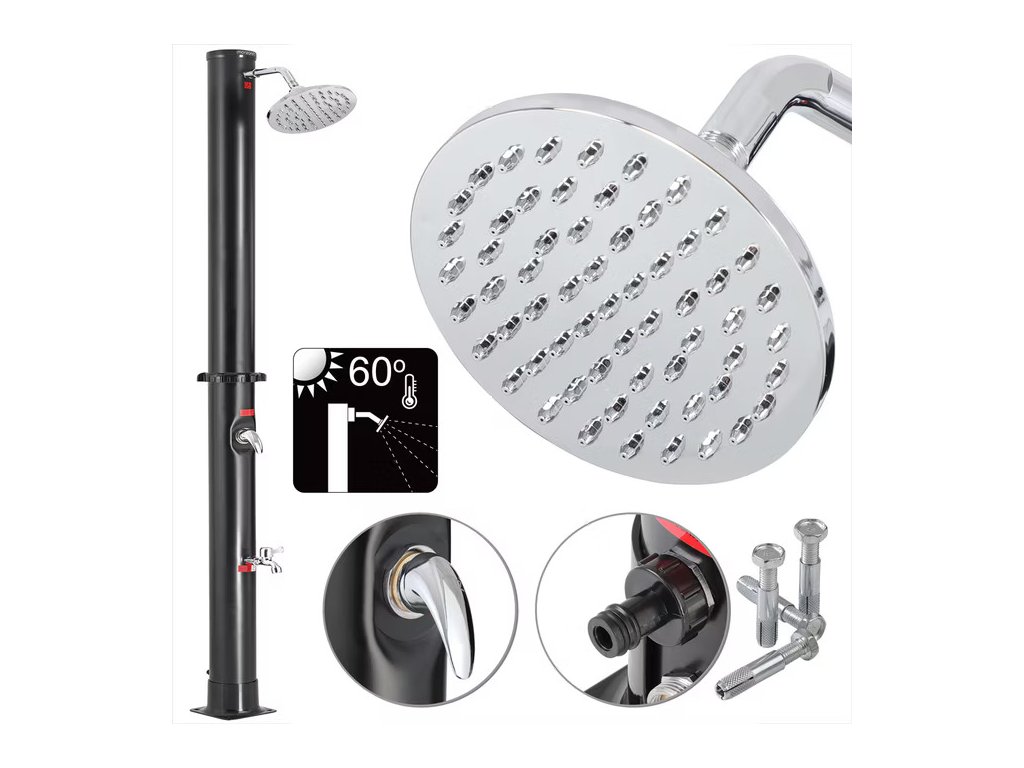 Pri optimálnom slnečnom svetle sa voda môže zohriať až do 60 °C bez potreby elektrickej energie. Stačí jednoducho pripojiť záhradnú hadicu a užiť si osviežujúcu sprchu pod holým nebom. Pochrómovaná kovová jednopáková batéria umožňuje plynulé nastavenie teploty vody, pričom v spodnej časti sa nachádza aj praktický vodovodný kohútik na odber studenej vody podľa potreby. Stabilitu sprchy zabezpečuje pevná kovová základňa, ktorá zaručuje bezpečné používanie. Záhradná sprcha poskytuje dokonalé osvieženie a vďaka otočnému mechanizmu s uhlom 180° ju môžete jednoducho nastaviť presne podľa svojich potrieb. Guľový kĺb umožňuje jej pohodlné prispôsobenie. Táto záhradná sprcha, vyrobená z UV odolného plastu, sa dá ľahko rozložiť a prepraviť.