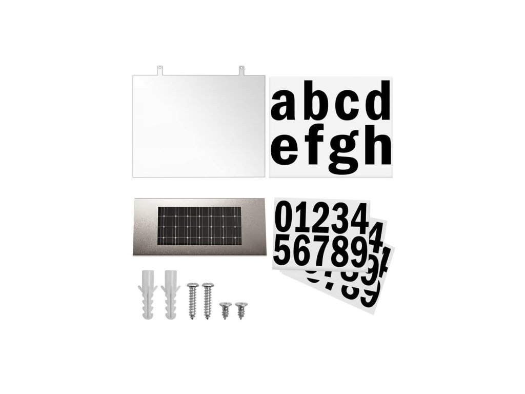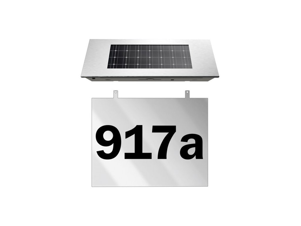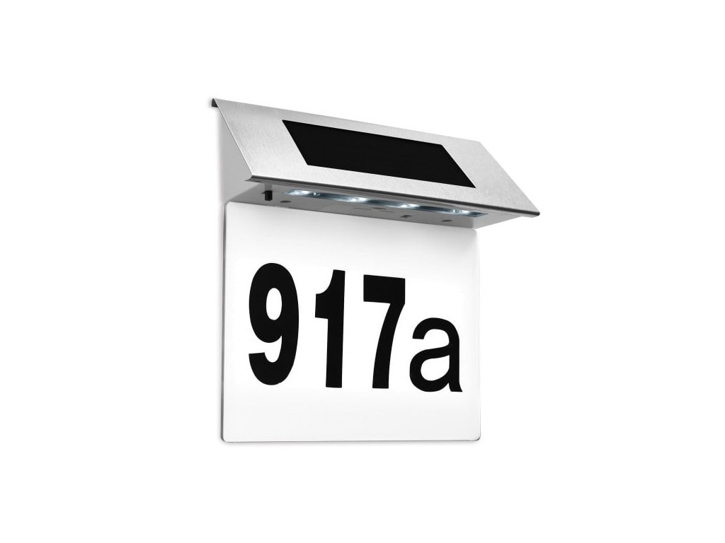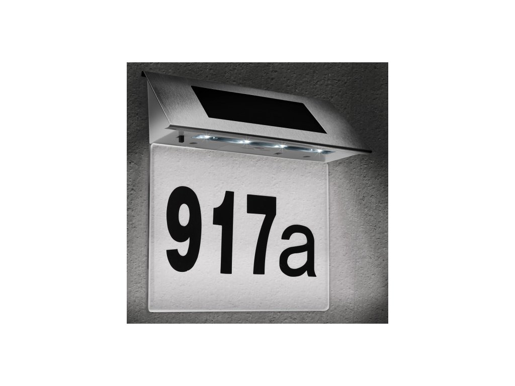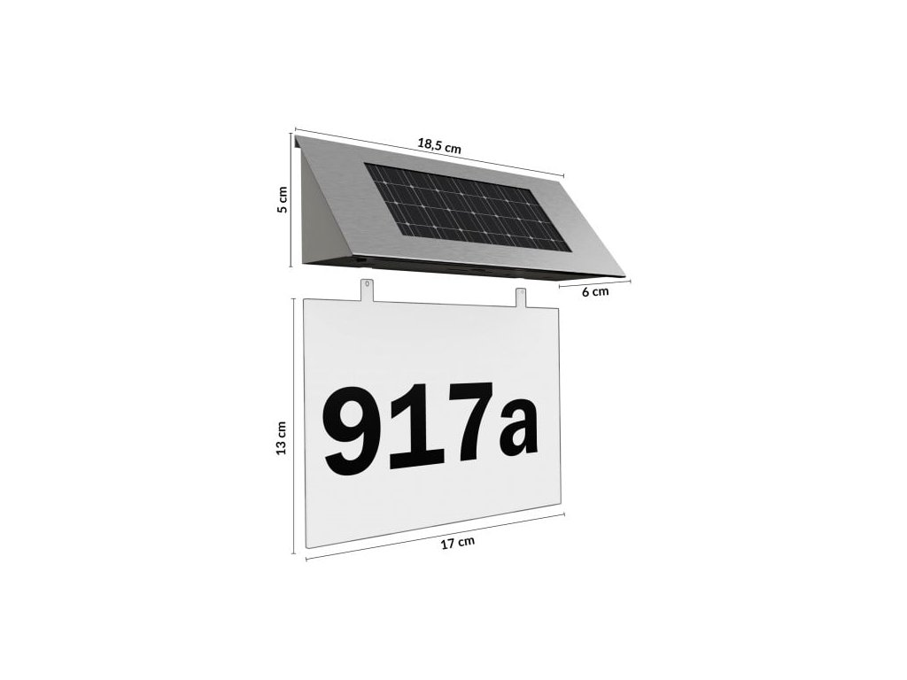 Zabudovaná batéria sa cez deň nabíja slnečným žiarením na solárnom paneli. Hneď ako sa zotmie, 4 LED diódy sa automaticky zapnú pomocou vstavaného súmrakového spínača. Solárne číslo domu má tiež vypínač. To znamená, že v prípade potreby môžete tiež priamo vypnúť číslo domu. Solárny držiak je vyrobený z nehrdzavejúcej ocele, číselný rad je vyrobený z tvrdeného plastu. Súčasťou dodávky sú 3 sady číselných nálepiek 0-9 a 1 sada malých písmen ah.