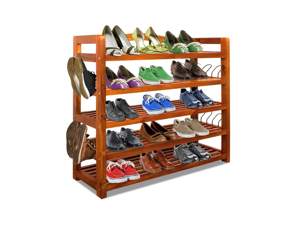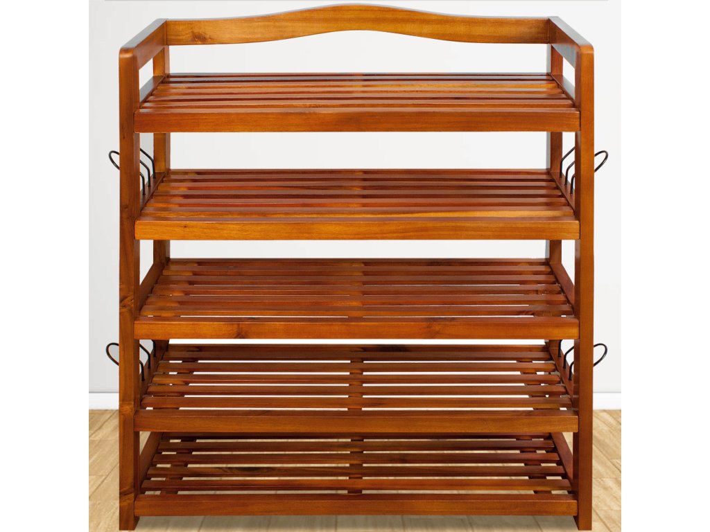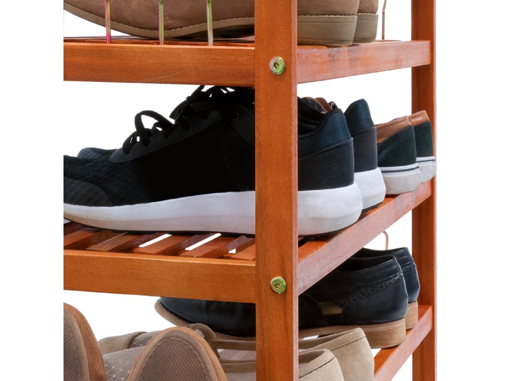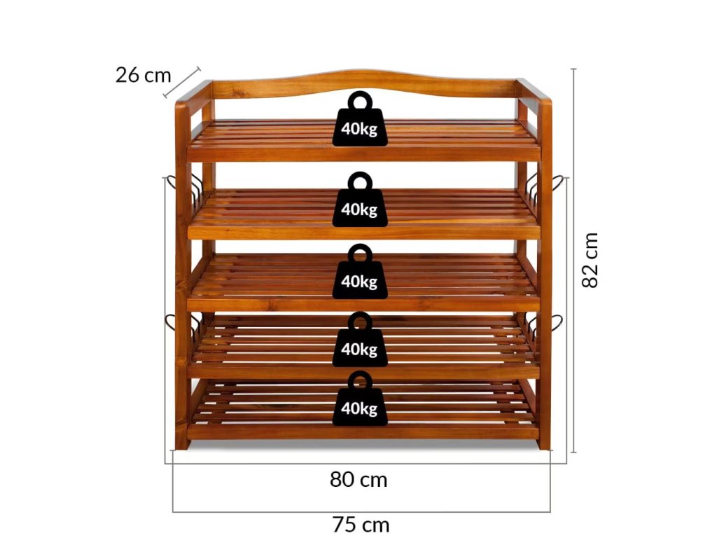 Tento kvalitný stojan na topánky v koloniálnom štýle ponúka dostatok priestoru na vašu obuv a zároveň je vkusným doplnkom interiéru. Je ideálny nielen na topánky, ale aj ako knižnica, úložná polica do kuchyne či kúpeľne. Bočné kovové držiaky poskytujú extra miesto na topánky a dajú sa podľa potreby odstrániť. Vďaka tomu môžete na stojan uložiť až 30 párov obuvi. Stabilitu zabezpečuje pevná drevená konštrukcia s piatimi odolnými policami a priečnymi výstuhami. Pri rovnomernom zaťažení unesie až 200 kg. Stojan na topánky je navyše možné rýchlo a jednoducho zložiť.