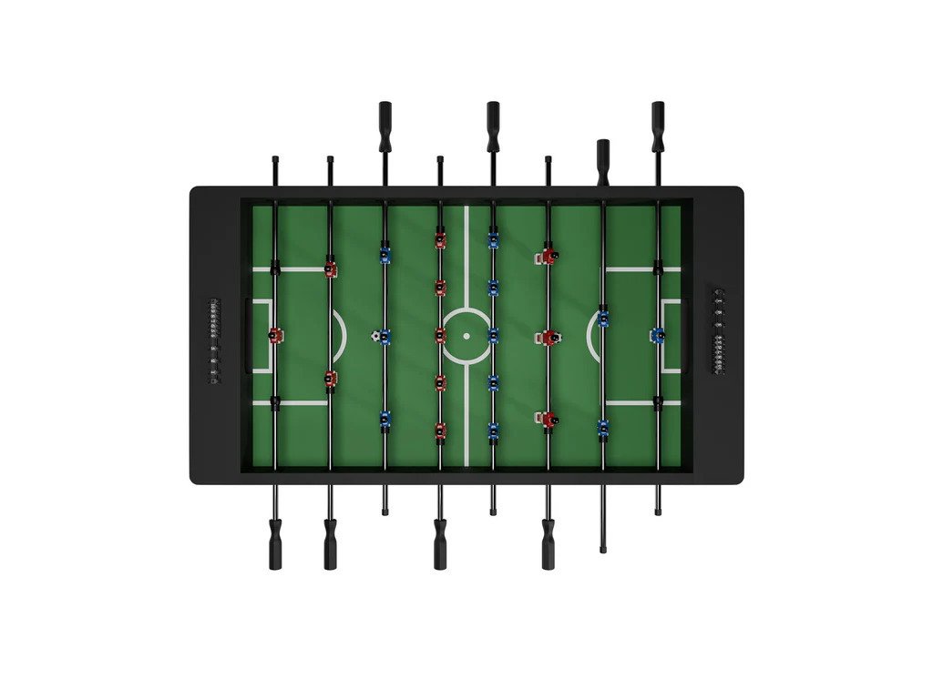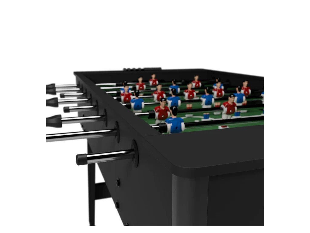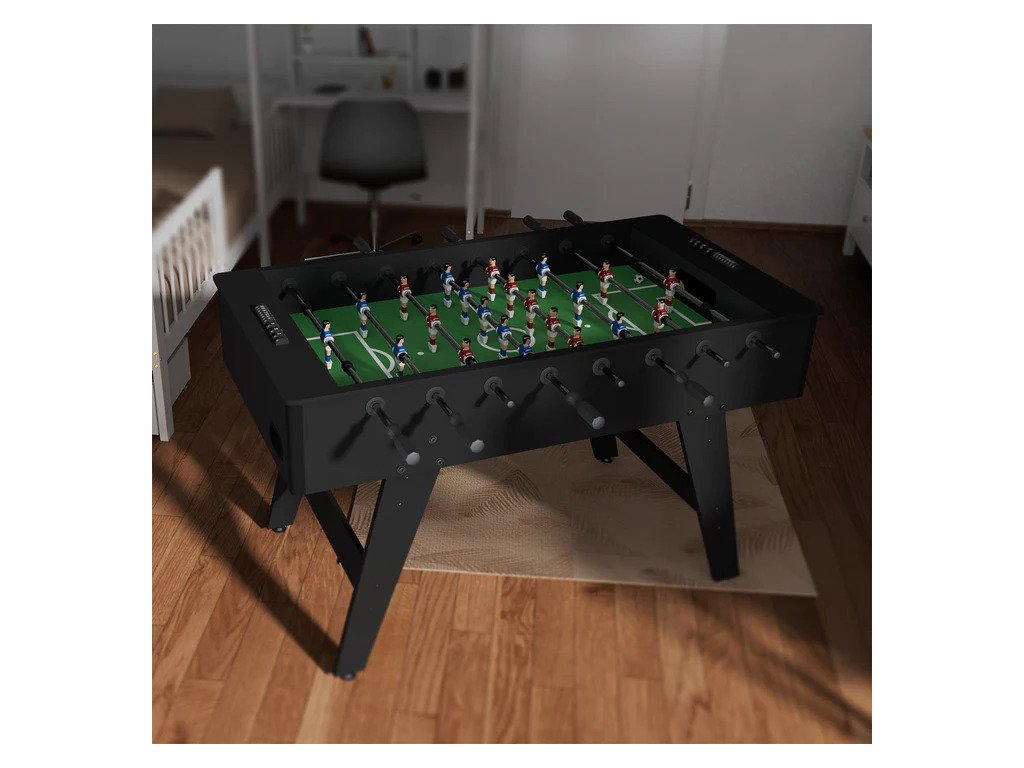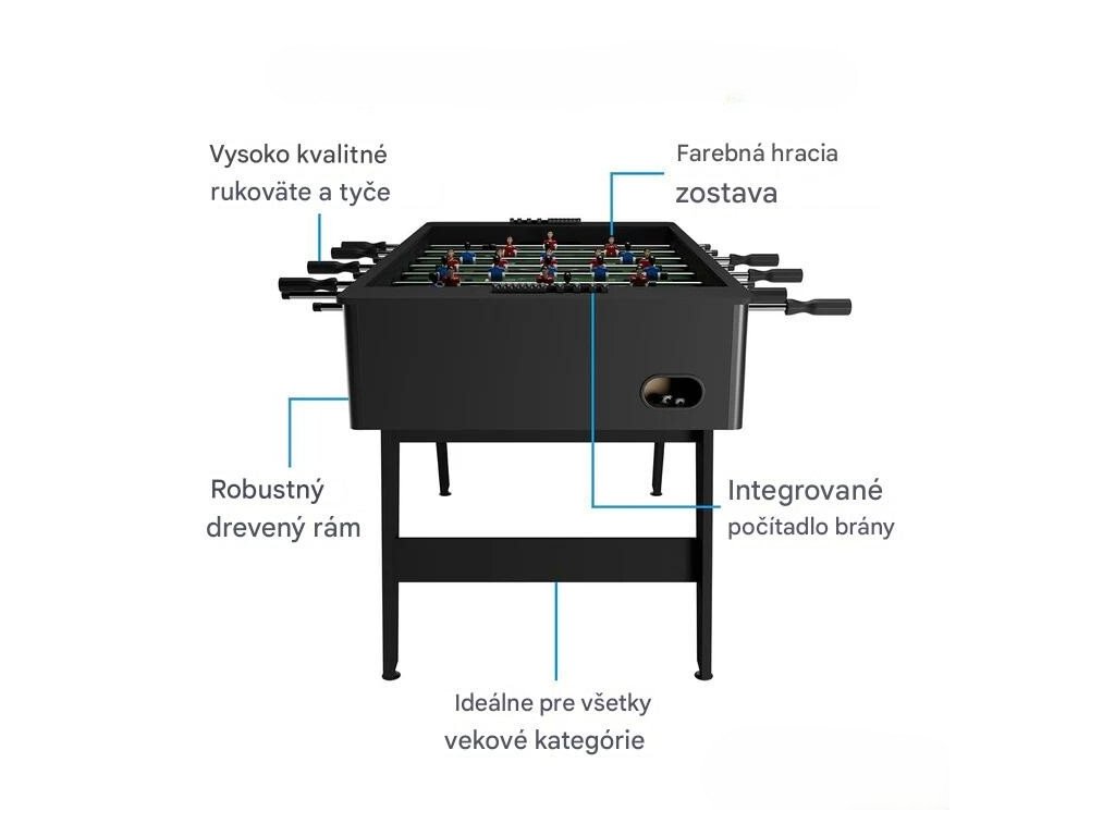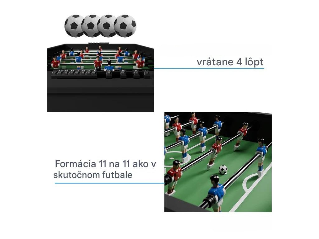 Stolný futbal prináša zábavu, ktorá spája generácie a vytvára nezabudnuteľné chvíle s rodinou či priateľmi. Moderný dizajn a kompaktné rozmery umožňujú umiestniť stôl do obývačky, detskej izby alebo hobby miestnosti, kde sa stane nielen zdrojom radosti, ale aj štýlovým doplnkom interiéru.Stabilný rám z MDF v kombinácii s odolným povrchom z PVC zaručuje pevnú konštrukciu a dlhú životnosť. Protišmykové rukoväte uľahčujú presné ovládanie hráčov a prinášajú autentický pocit zo skutočného futbalu. Klasické rozostavenie 11 na 11 poskytuje realistický herný zážitok a integrované počítadlá gólov na oboch stranách pridávajú do každej partie súťaživého ducha. Stolný futbal je ideálny na rodinné večery, detské oslavy či priateľské zápasy, kde sa šampiónom môže stať každý bez ohľadu na vek. Vďaka odolnej konštrukcii a praktickým rozmerom je tento stôl spoľahlivým spoločníkom pre hodiny zábavy.Technické špecifikácie: