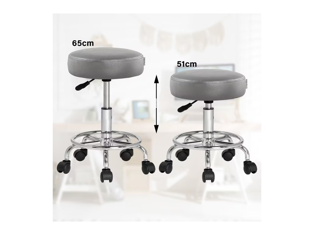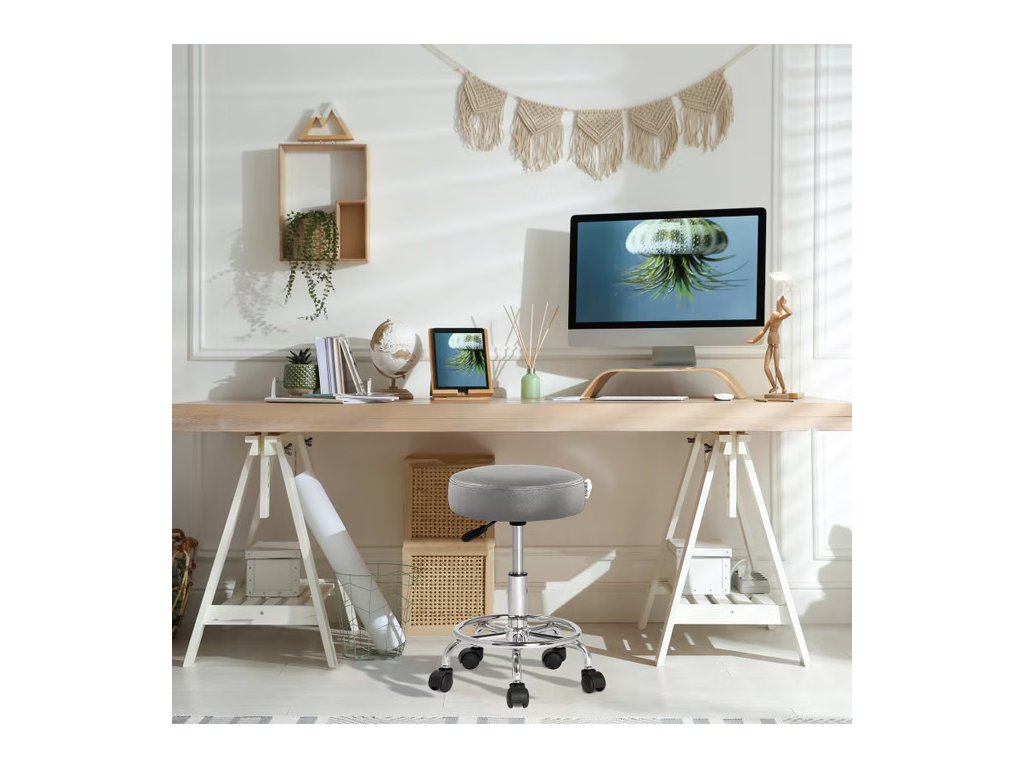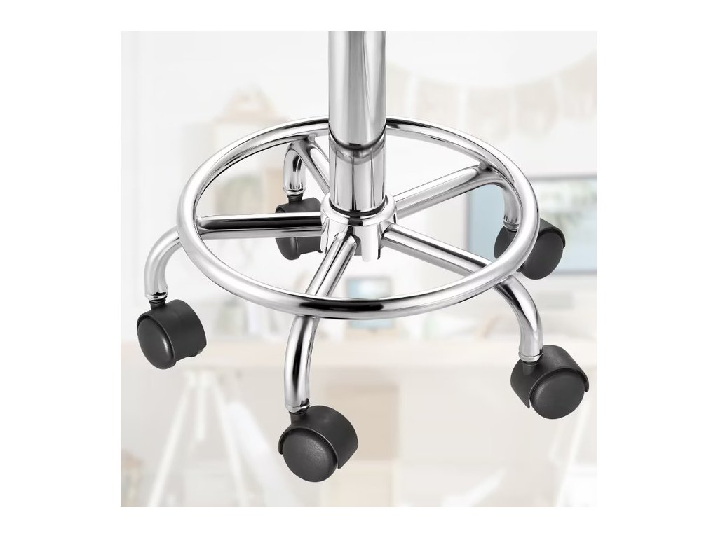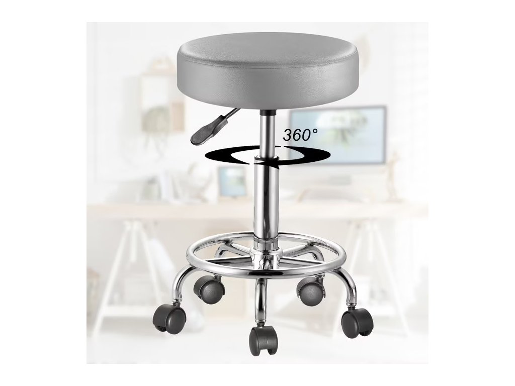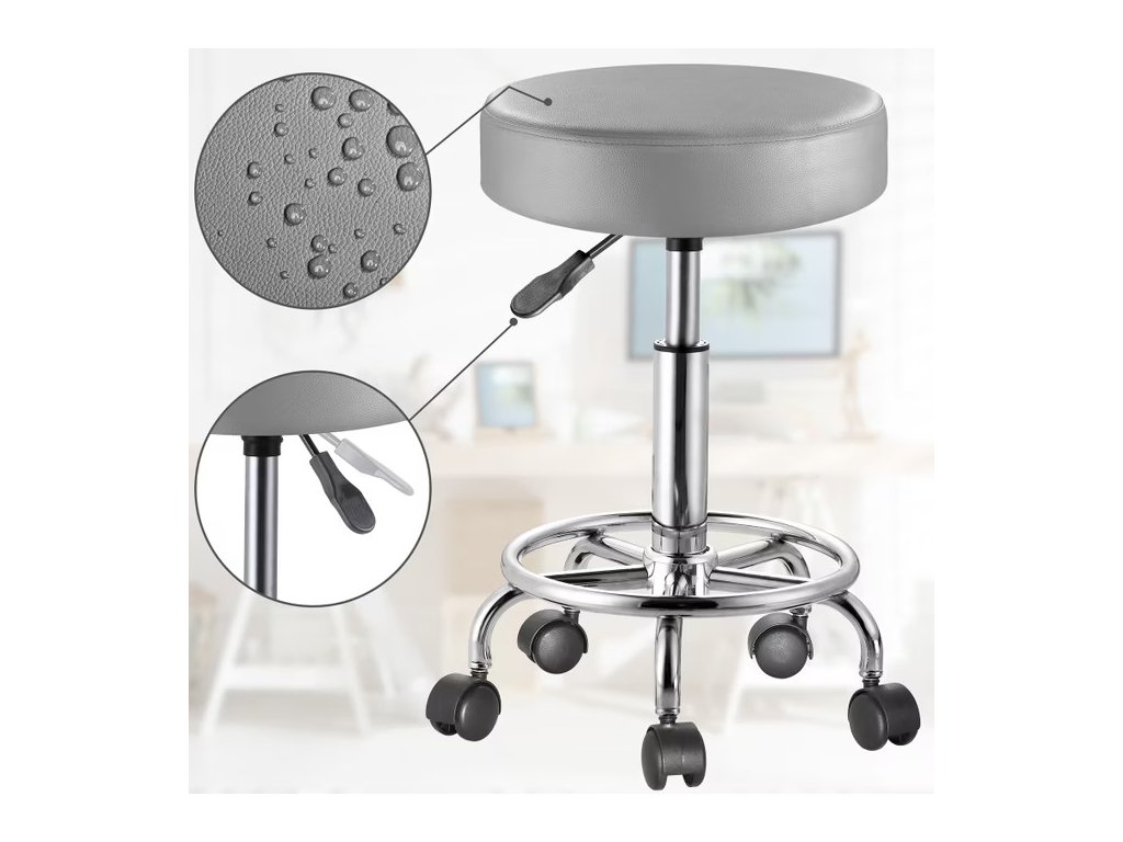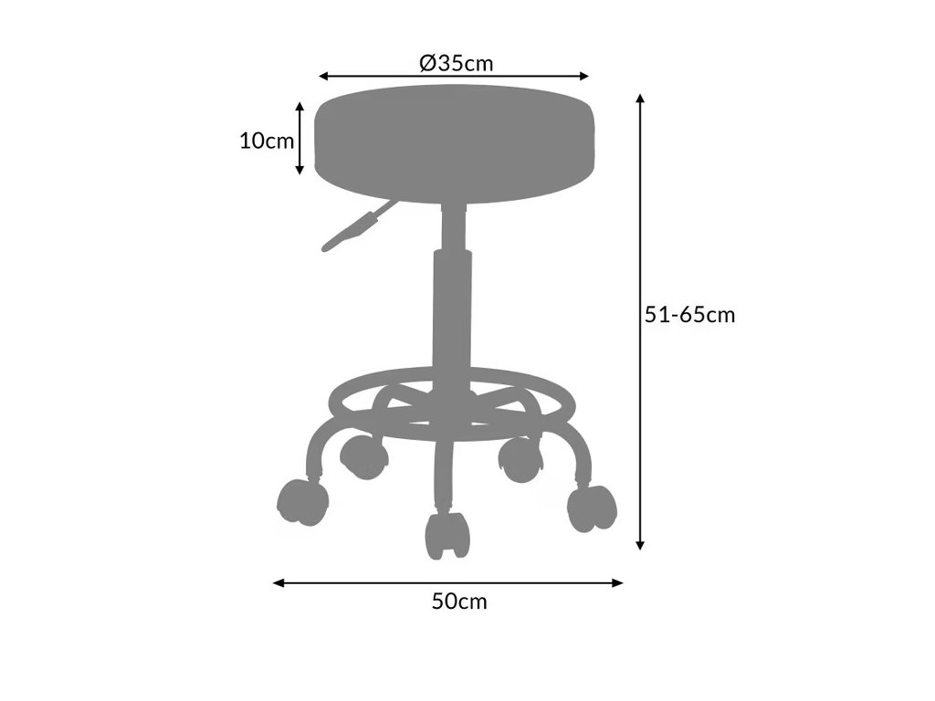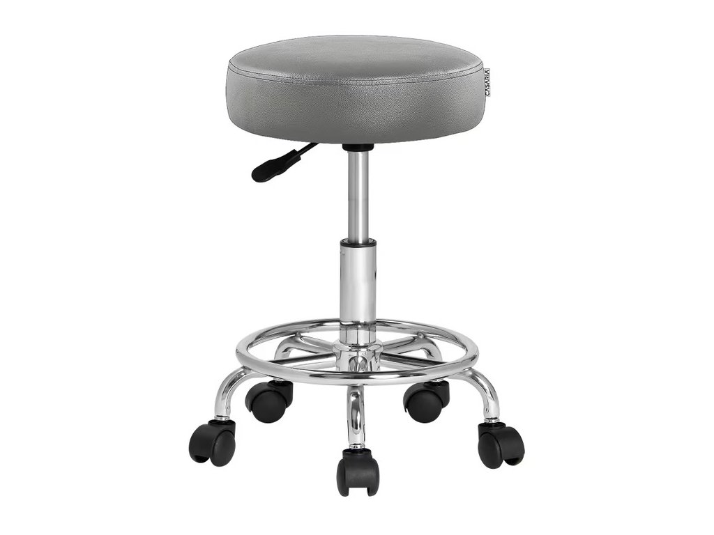 Otočná taburetka ponúka vysoký komfort sedenia a veľkú flexibilitu. Pracovná taburetka je plynule výškovo nastaviteľná a voľne otočná o 360° a má tiež pochrómovanú oceľovú základňu s 5 kolieskami pre optimálnu stabilitu. Ako pohodlná opierka nôh slúži krúžok na nohy z chrómovanej ocele. Podsedák s hrúbkou 10 cm a plynová pružina zaisťujú optimálny komfort sedenia. Poťah taburetky je vyrobený z umelej kože, ktorá sa ľahko udržiava a je odolná. To znamená, že hladký povrch sa dá rýchlo a jednoducho vyčistiť.