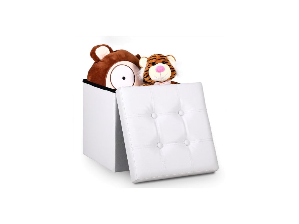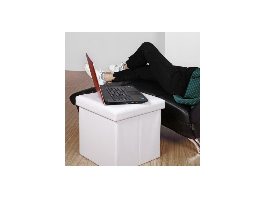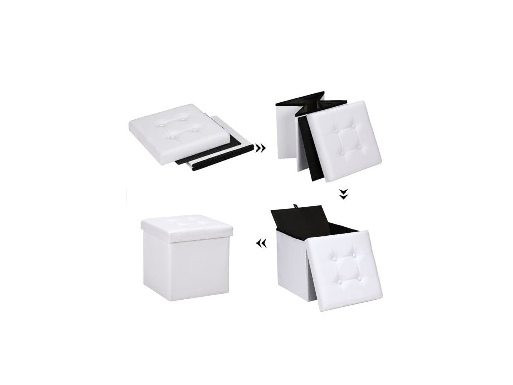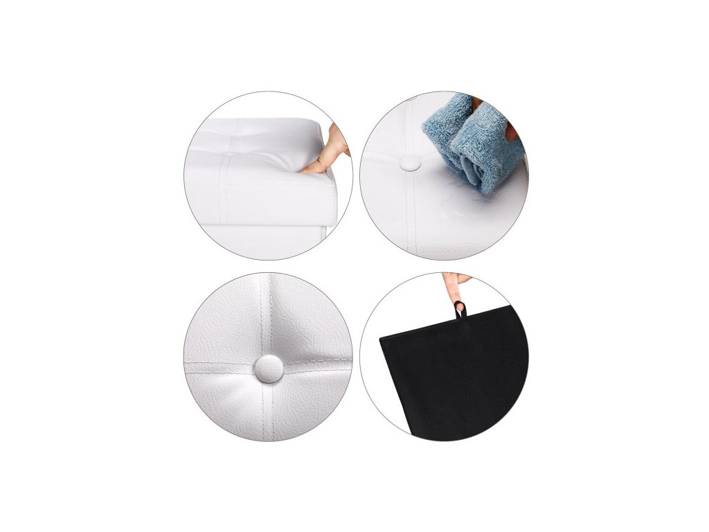 Rám taburetky je vyrobený zo stabilnej MDF drevovláknitej dosky. Vrchná časť so štýlovými gombíkmi je extra hrubá a povrch je vodoodpudivý a ľahko sa čistí vlhkou handričkou. Sedák je čalúnený penou s vysokou hustotou a zaisťuje tak príjemný komfort sedenia. Vnútorné dno taburetky chráni obsah pred vlhkosťou. S úložným priestorom 55 litrov je taburetka veľmi priestrannou a praktickou pomôckou na uskladnenie hračiek, časopisov, CD/DVD, kníh, oblečenia a mnoho ďalšieho. Ak taburetku nepotrebujete, môžete ju zložiť a uložiť, aby ste ušetrili miesto.