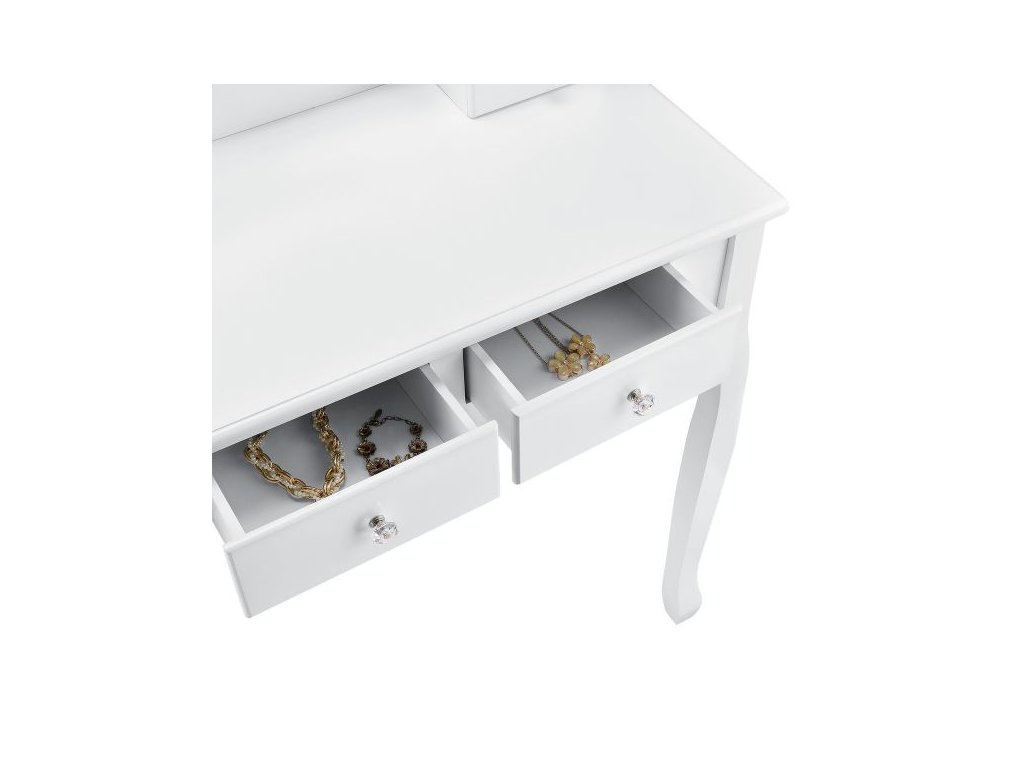 Kozmetický stolík je vybavený štyrmi zásuvkami - dvoma zásuvkami v stole a ďalšími dvoma v zrkadle. Ponúknu vám dostatok úložného priestoru na odkladanie štetcov, ceruziek, maskary a ďalších doplnkov na líčenie. Všetky nádoby máte uložené na jednom mieste, čisté a vždy po ruke. Pohodlná stolička s hrubým čalúnením poskytuje ďalšie pohodlie. Mäkké čalúnenie vám umožní pohodlne sedieť, aby ste sa mohli v pokoji pripraviť. Poťah s kvetinovým kvetinovým vzorom dodáva stoličke romantický vzhľad. toaletný stolík je vyrobený z bieleho lakovaného dreva MDF. Solídne spracovanie zaručuje bezpečný stojan a dlhú životnosť. Vďaka laku sú povrchy odolné proti poškriabaniu a ľahko sa čistia.