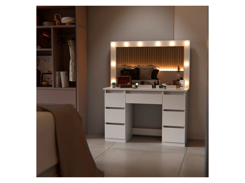 Elegantný toaletný stolík Lilia prináša do spálne poriadok a štýl. Integrované zrkadlo je vybavené 10 LED svetlami, ktorých jas a teplotu farieb je možné individuálne nastaviť. So siedmimi zásuvkami ponúka toaletný stolík dostatok úložného priestoru na make-up a šperky. Vďaka minimalistickému dizajnu s čistými líniami a bielou farbou sa toaletný stolík stáva elegantným a výrazným prvkom spálne či tínedžerskej izby. So šírkou 108 cm je stolík vhodný aj do menších priestorov, pričom jeho pevná konštrukcia zaručuje stabilitu a nosnosť až do 50 kg. Hladký povrch sa dá ľahko čistiť vlhkou handričkou a je odolný voči poškriabaniu, prachu a zvyškom kozmetiky.Technické špecifikácie: