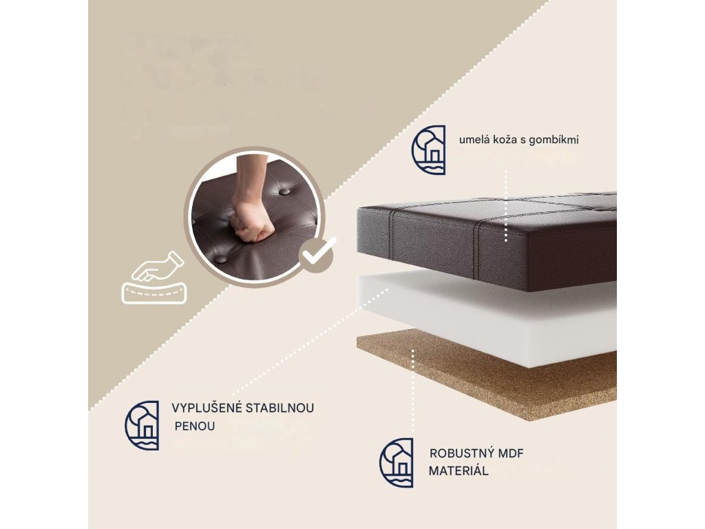 Rám lavice je vyrobený z pevného MDF materiálu čo zaručuje vysokú stabilitu a odolnosť. Veko lavice je mimoriadne hrubé a otvarateľné z oboch strán, čo umožňuje rýchly a pohodlný prístup k uloženým predmetom vo vnútri priestrannej lavice.