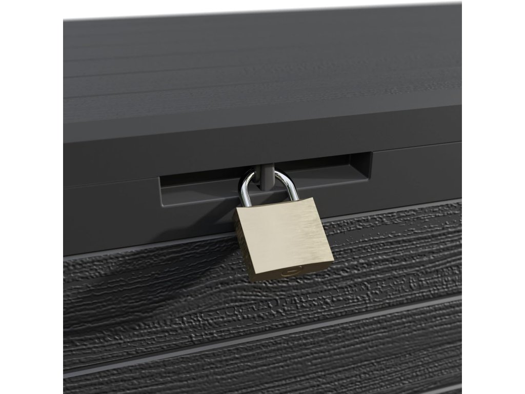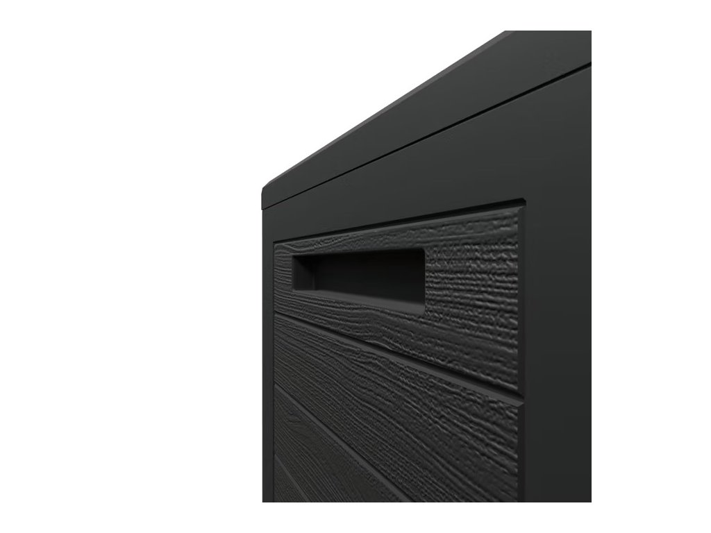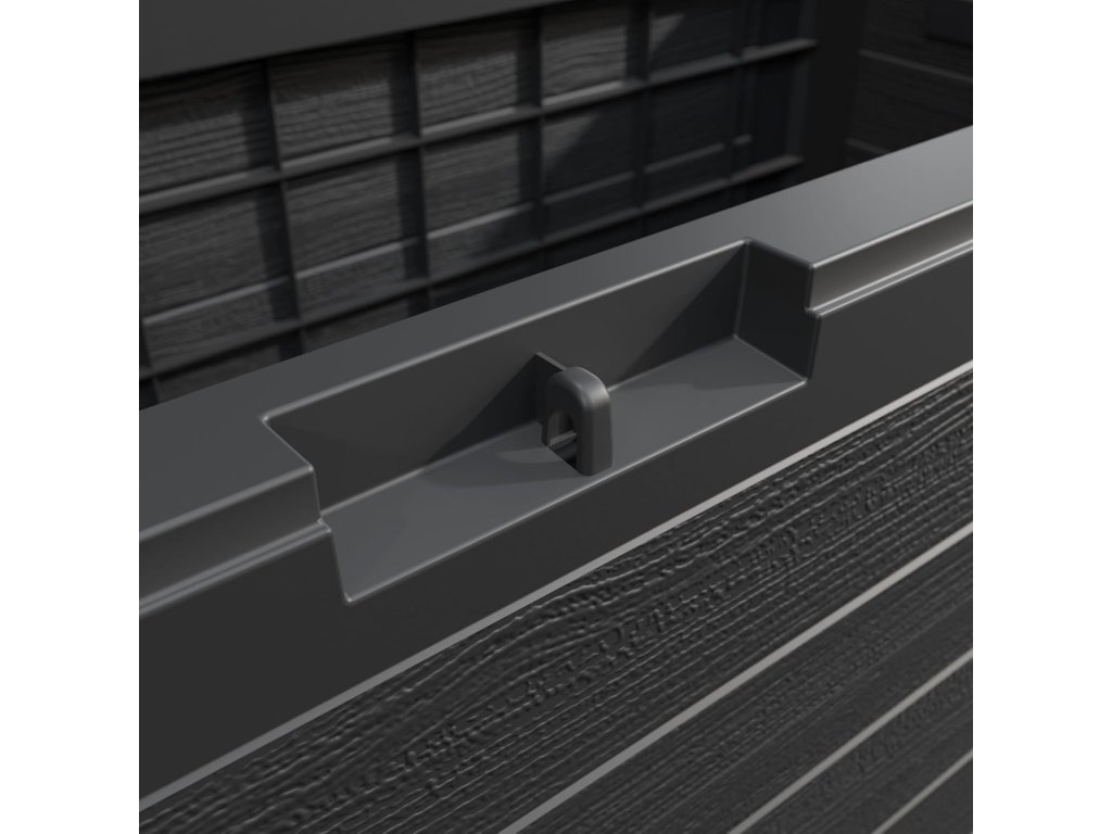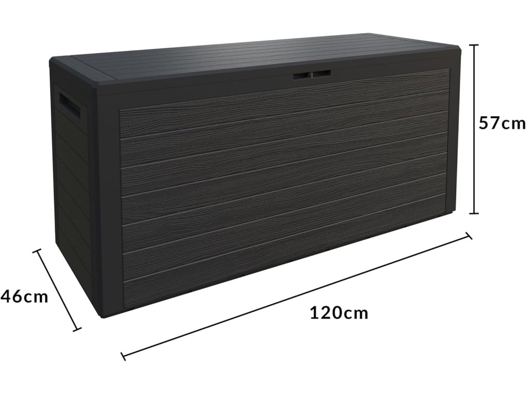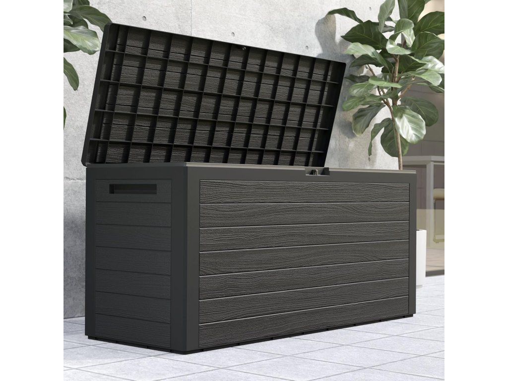 Záhradný box v modernom drevenom dizajne s objemom 280 litrov poskytuje priestor na uskladnenie vankúšov, podsedákov, záhradného príslušenstva, hračiek a ďalších potrieb. Tento úložný box je vyrobený z plastu odolného voči poveternostným vplyvom a je vybavený výklopným vekom s integrovaným uzamykacím mechanizmom pre bezpečné uloženie vašich vecí. Praktické zapustené úchyty po bokoch zaisťujú jednoduchú manipuláciu a presúvanie boxu. Elegantná a nadčasová farebná úprava boxu sa dokonale prispôsobí rôznym štýlom zariadenia, čím je ideálny nielen na terasu, záhradu alebo balkón, ale aj do interiéru. Jednotlivé diely do seba jednoducho zapadnú, čím si zvolíte pohodlnú montáž. Box nie je vhodný na sedenie alebo státie.