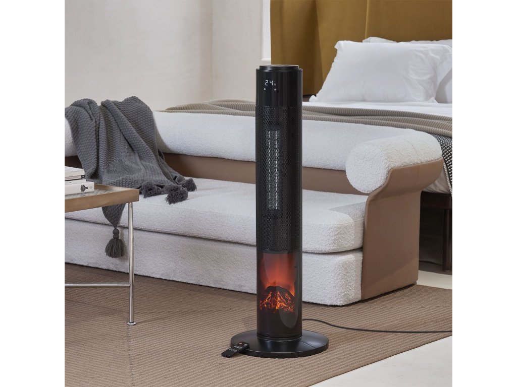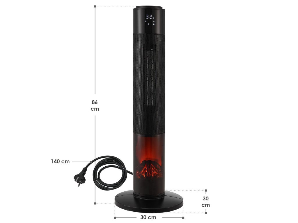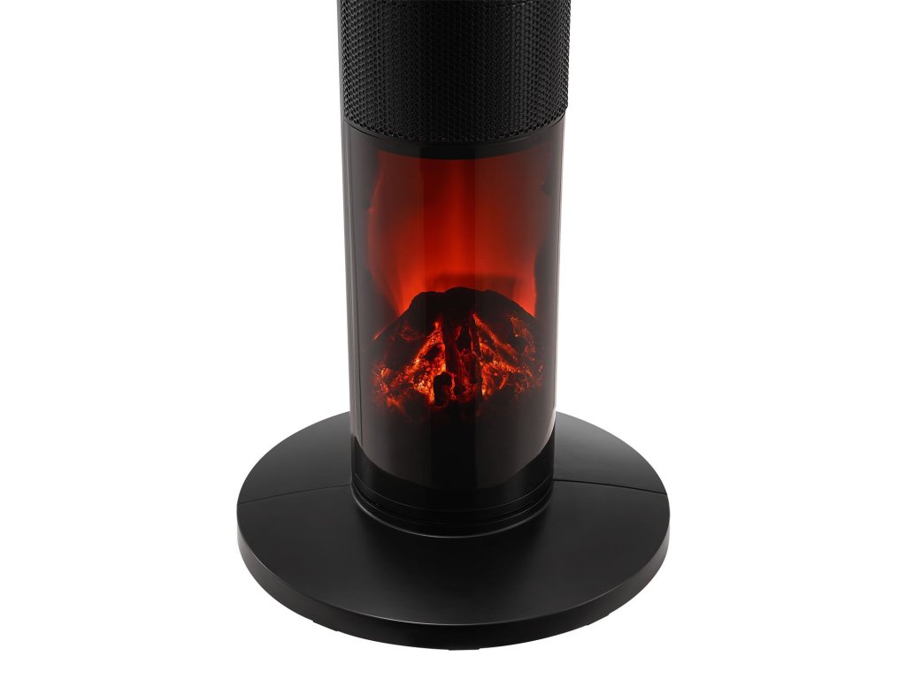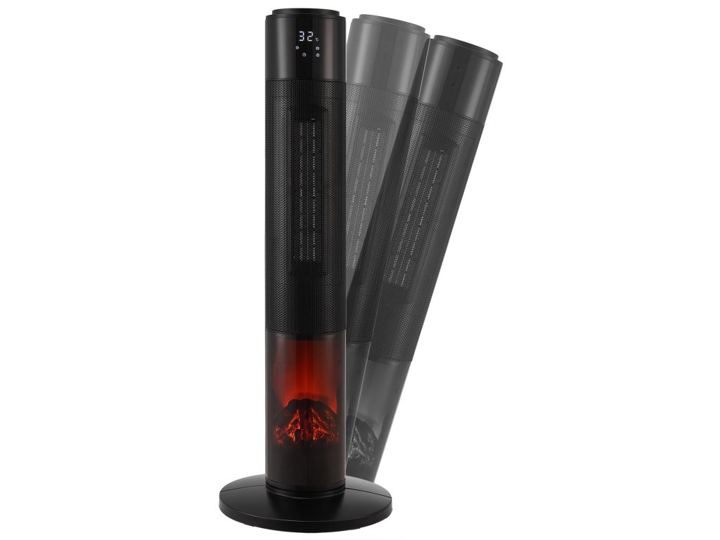 Vysokokvalitný keramický vežový ohrievač s komínovým efektom poskytuje dodatočné teplo vo vašej obývačke. Jeho tenký dizajn v jemnej čiernej farbe je mimoriadne úsporný a nenápadný. Okrem želanej teploty medzi 18 a 45 °C si môžete zvoliť aj stupeň ohrevu alebo jednoducho aktivovať praktický časovač. Ventilátor je otočný v uhle 50° a zaisťuje tak obzvlášť dobrú distribúciu teplého vzduchu. Prístroj má navyše praktickú funkciu 8-hodinového časovača. Aktivujte efekt dekoratívneho komína, animácia simuluje živý krb a vytvára mimoriadne romantickú a útulnú atmosféru.