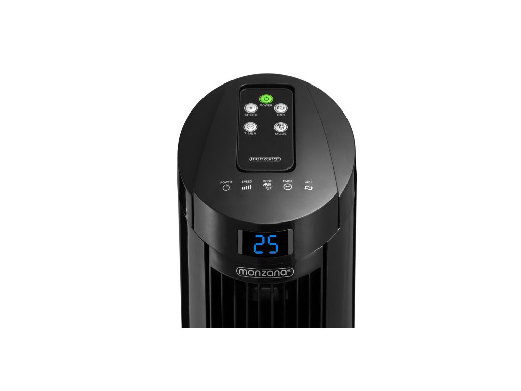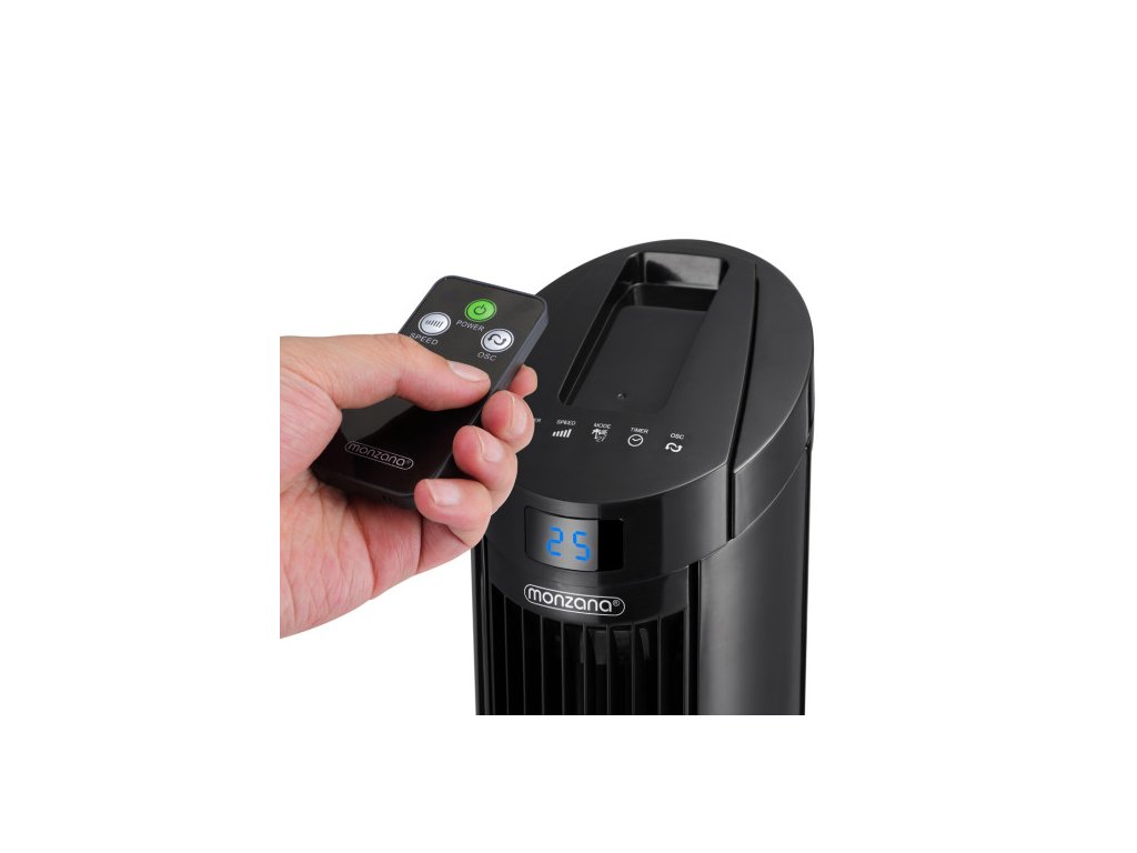 Vežový ventilátor s funkciou turbo prináša príjemný chlad do vášho domu alebo kancelárie rýchlosťou až 6 m/s. Pomocou diaľkového ovládača si môžete vybrať medzi 3 rôznymi úrovňami rýchlosti. Ventilátor sa otáča smerom dopredu a dozadu pod uhlom 70° a vďaka časovaču si môžete presne nastaviť, ako dlho má byť ventilátor aktívny. Dodávaný je s praktickým aroma boxom a 2 aroma podložkami. Box sa dá jednoducho pripevniť na ventilátor, a tak si okrem príjemného vánku môžete vychutnať aj vôňu podľa vlastného výberu.