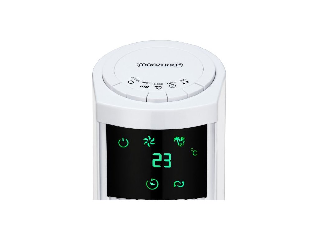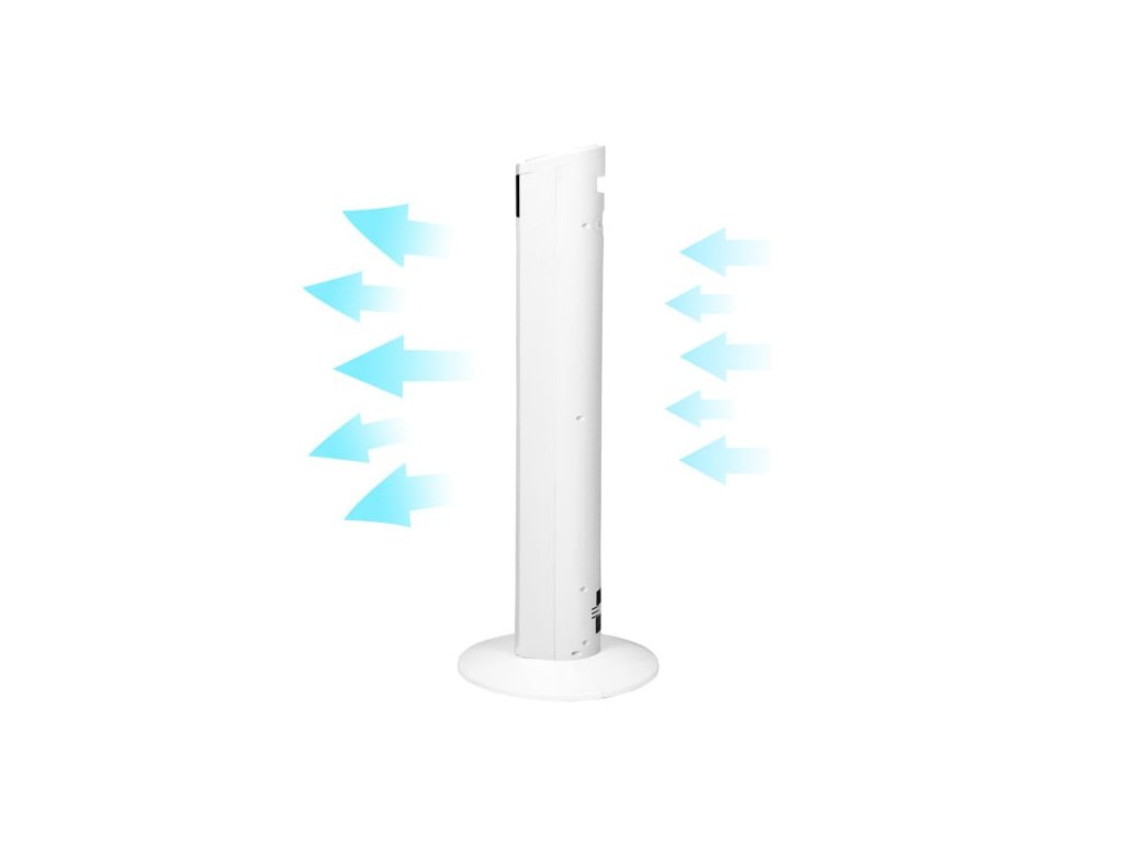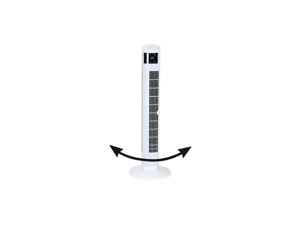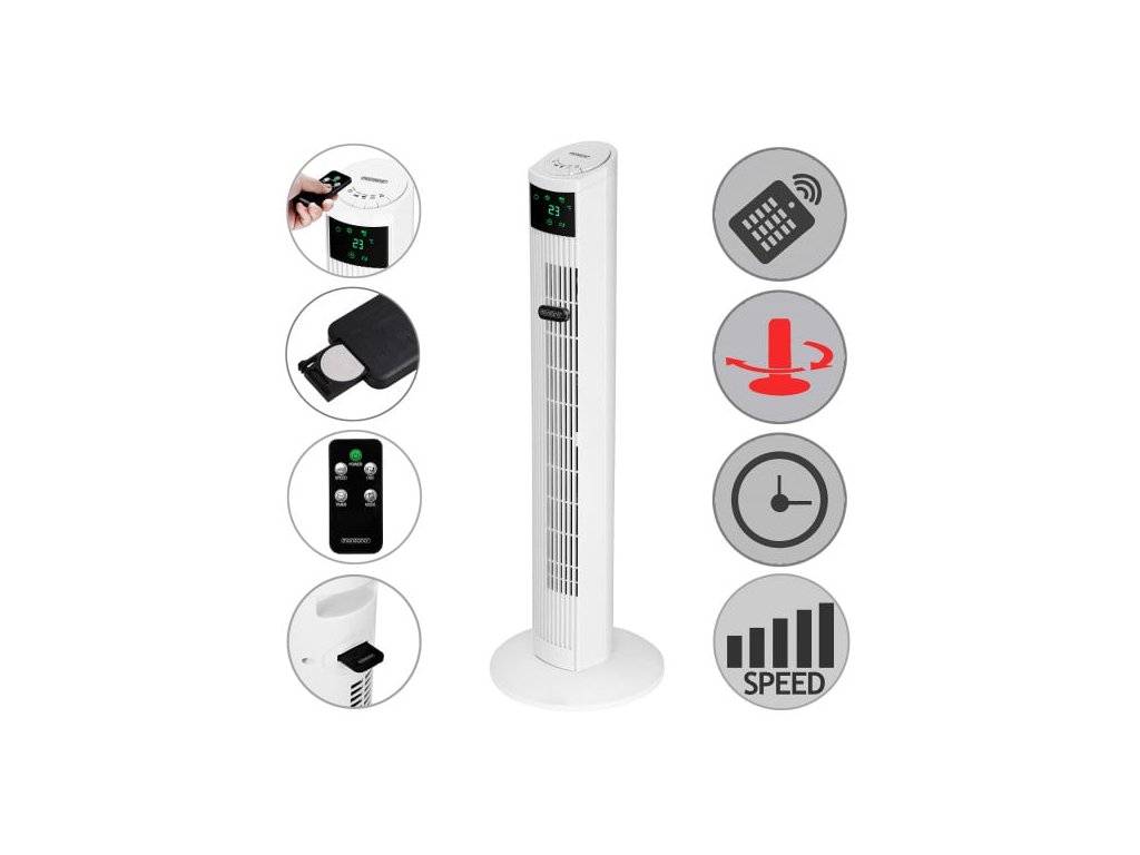 Vežový ventilátor s displejom a funkciou turbo prináša príjemný chlad do vášho domu alebo kancelárie rýchlosťou až 7 m/s. Pomocou diaľkového ovládača si môžete vybrať medzi 4 rôznymi úrovňami rýchlosti. Ventilátor sa otáča smerom dopredu a dozadu pod uhlom 90° a vďaka časovaču si môžete presne nastaviť, ako dlho má byť ventilátor aktívny. Počet stupňov zobrazený na displeji udáva teplotu v miestnosti. Dodávaný je s praktickým aroma boxom a 2 aroma podložkami. Box sa dá jednoducho pripevniť na ventilátor, a tak si okrem príjemného vánku môžete vychutnať aj vôňu podľa vlastného výberu.