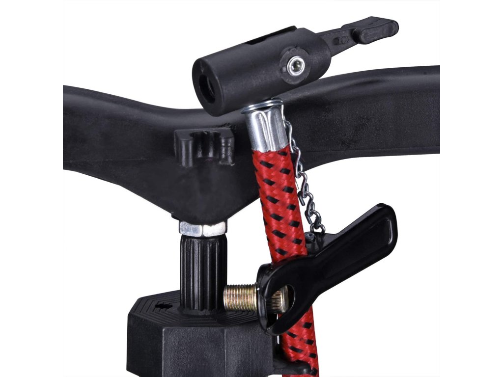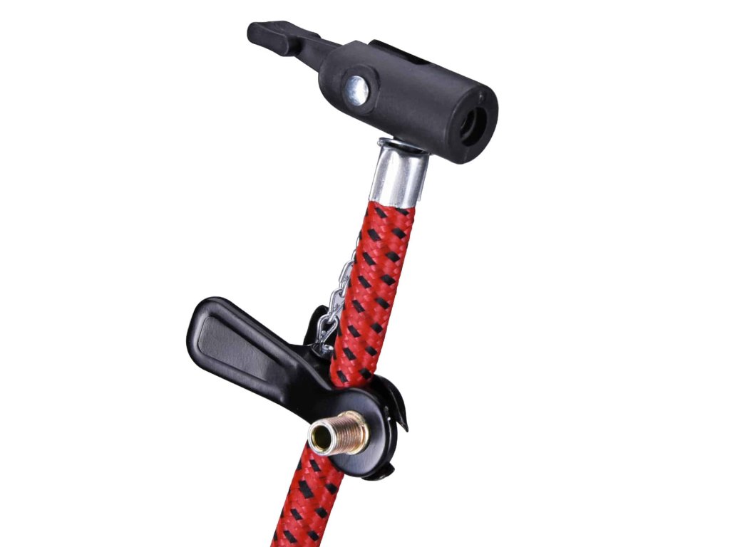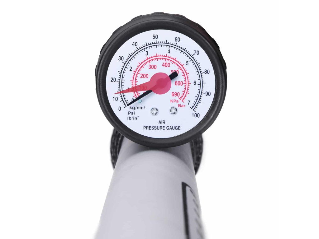 Hliníková stojanová pumpa je vybavená indikátorom tlaku s rozsahom merania 0-7 bar s pohodlnou výšku 57 cm. Univerzálna koncovka je vhodná pre všetky ventily bicyklov, áut, nafukovacích člnov, lôpt atď. Kovová pätka na boku zaisťuje bezpečné postavenie pri pumpovaní. Zosilnená tyč pumpy je veľmi robustná a zaisťuje pohodlné nafukovanie.