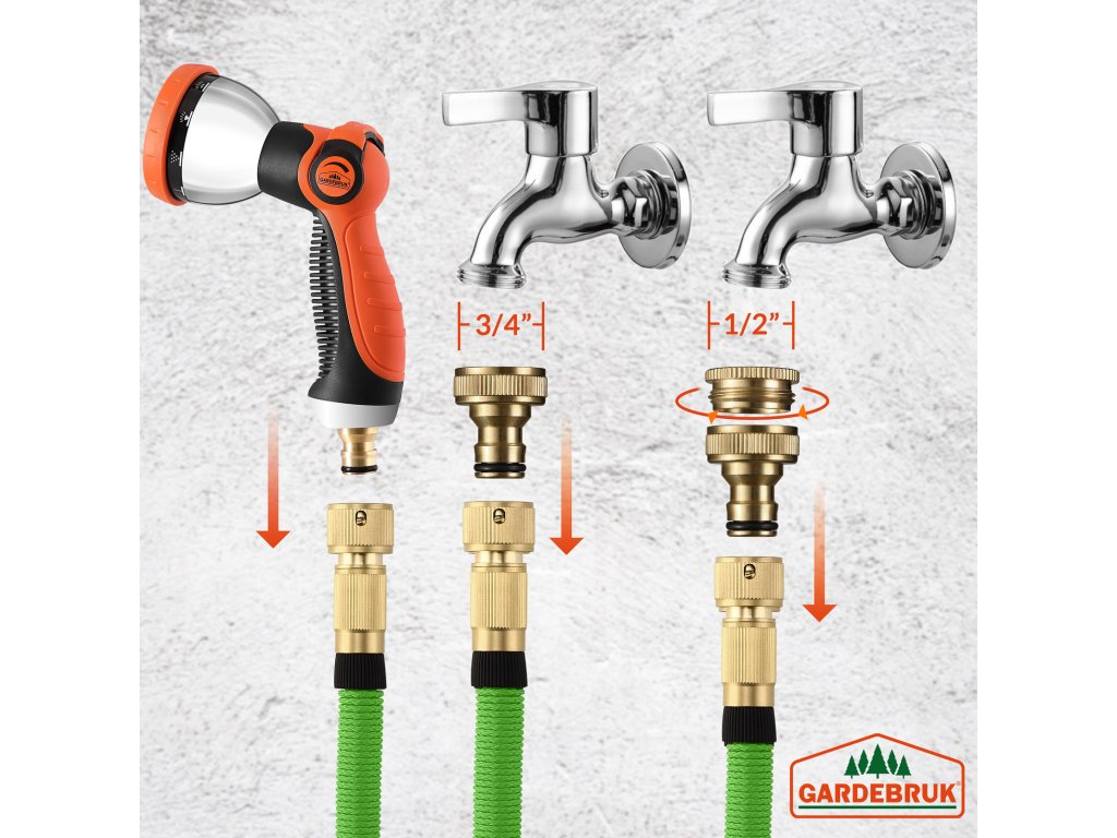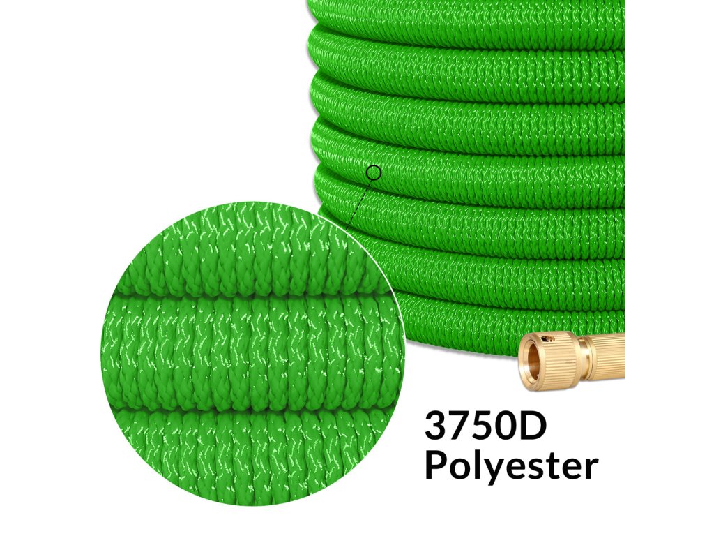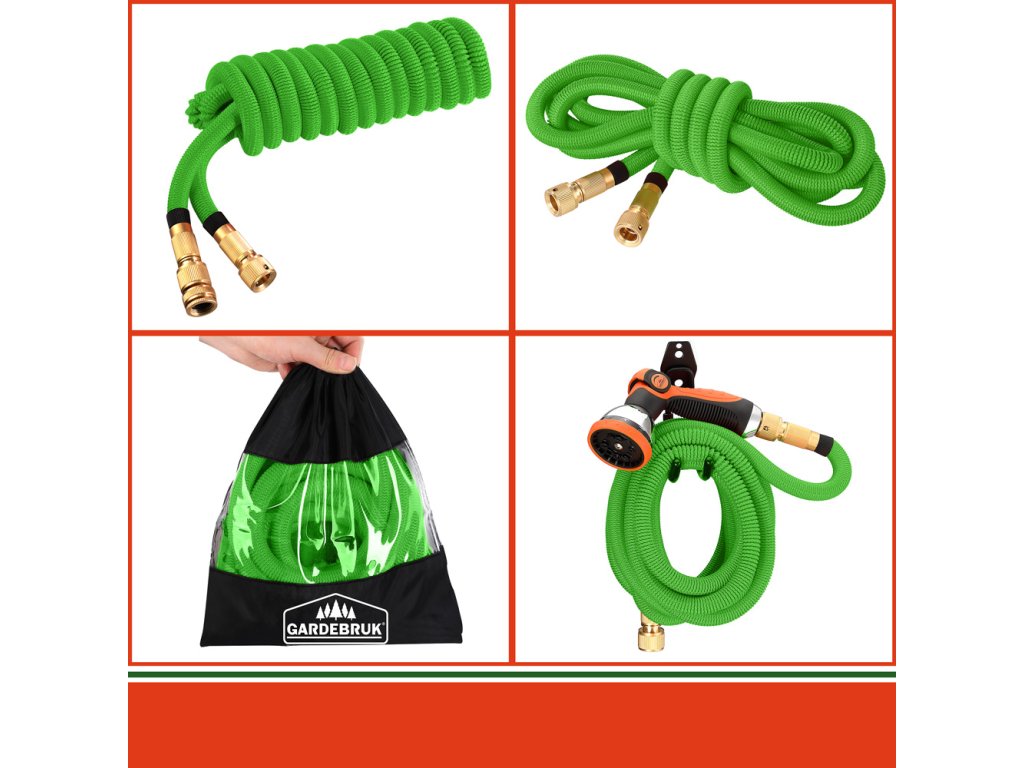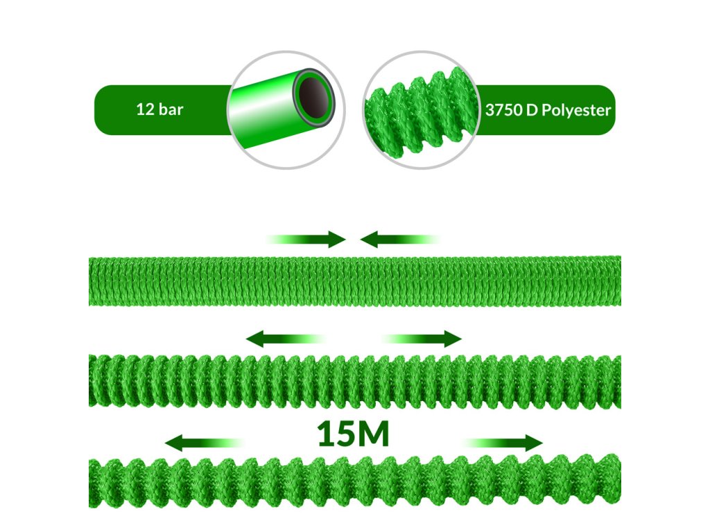 Hadica je vyrobená z 3750D polyesteru s trojitým latexovým jadrom, odolá tlaku vody až 12 barov a je mimoriadne odolná vďaka robustnému materiálu. Rozprašovacia hlava má desať funkcií: 8-smerovo nastaviteľné rozprašovanie, reguláciu tlaku a praktickú aretáciu tlačidla rozprašovača. Flexibilná rukoväť hadice má optimalizované uchopenie, ktoré je pokryté protišmykovou vrstvou. Hadicu môžete uložiť do vhodného priehľadného úložného vrecka.