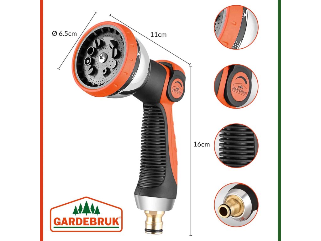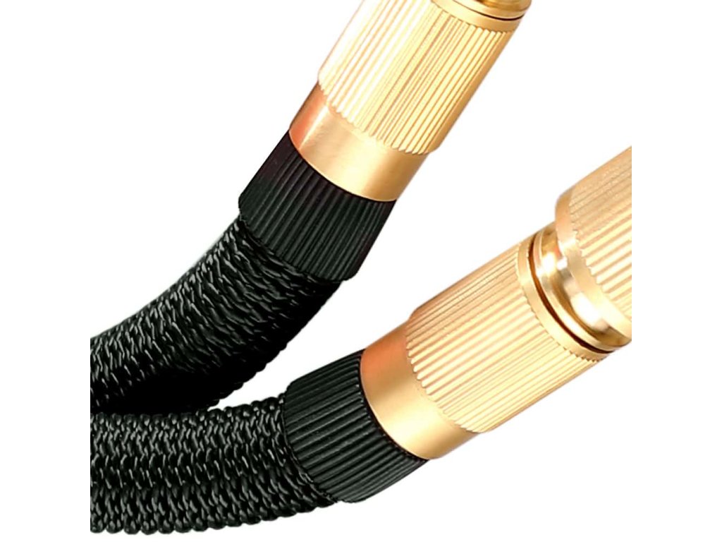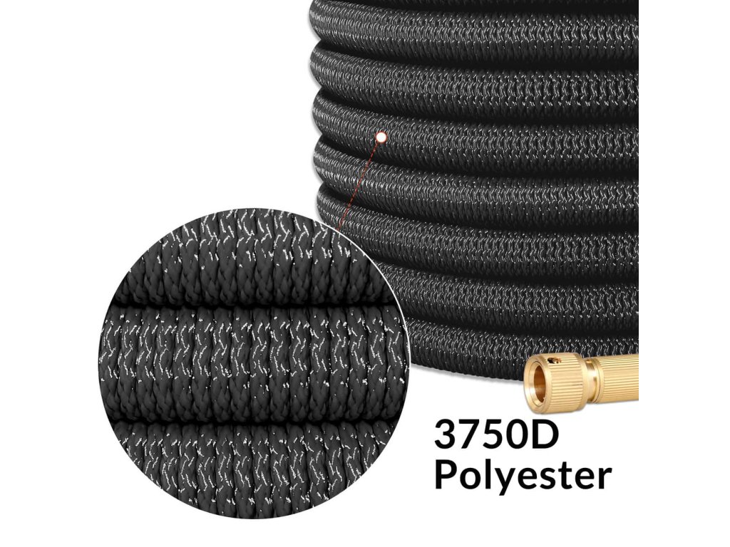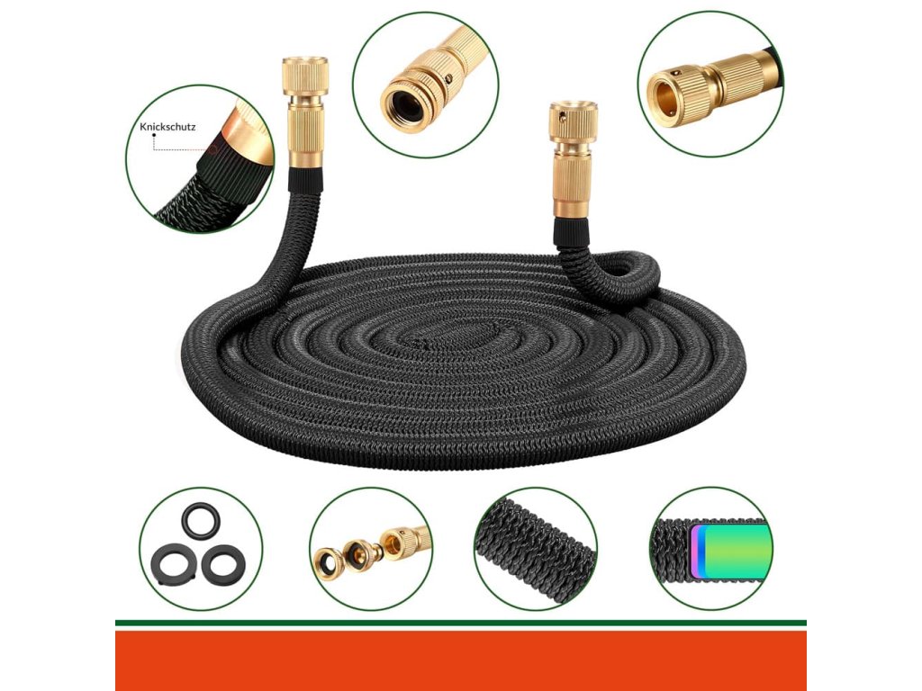 Záhradná hadica je vyrobená z 3750D x 3750D polyesteru s trojitým latexovým jadrom, odoláva tlaku vody až 12 barov a je mimoriadne odolná vďaka robustnému materiálu. Rozprašovacia hlavica je vyrobená z nárazuvzdorného ABS v elegantnom chrómovom vzhľade. Hadica má nerezové masívne mosadzné adaptéry, ktoré sa roztiahnu z ½ na ¾ palca, takže hadicu môžete pripojiť kdekoľvek. Súčasťou dodávky sú aj dve gumové tesnenia ako náhradné diely. Postrekovacia hlava má 10 funkcií : 8-smerovo nastaviteľný postrek, ako aj reguláciu tlaku a praktickú aretáciu tlačidla postrekovača, ktorá je dôležitá pre jemné zavlažovanie citlivých rastlín. Optimalizovaná rukoväť ohybnej hadice s protišmykovým povrchom zaisťuje dokonalé uchopenie. Vysokokvalitný lakovaný nástenný držiak má gumenú výstelku na ochranu materiálu. Ľahkú záhradnú hadicu možno zavesiť, aby ste ušetrili miesto pre poriadok a bezpečnosť vo vašej záhrade. Na prepravu hadice (napr. na záhradu, do dovolenkovej destinácie) je možné ju uložiť do praktického úložného vrecka s priezorom .