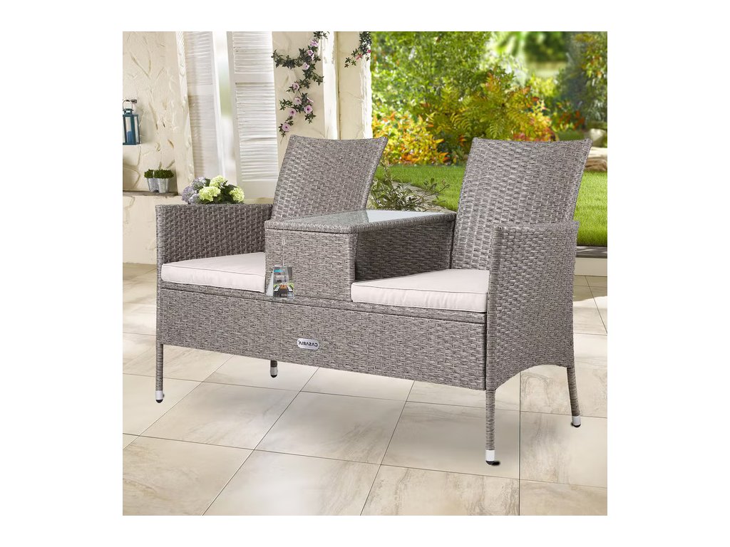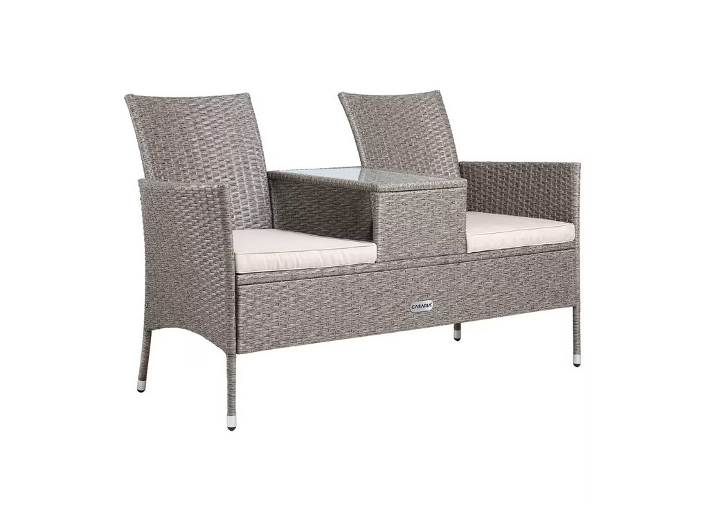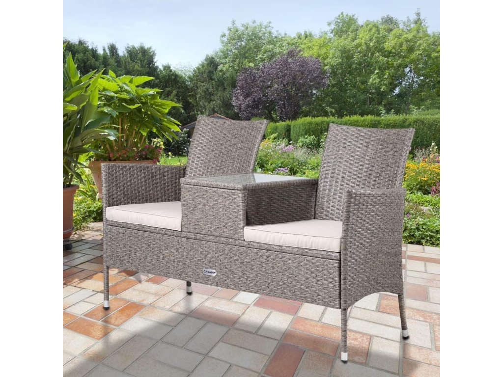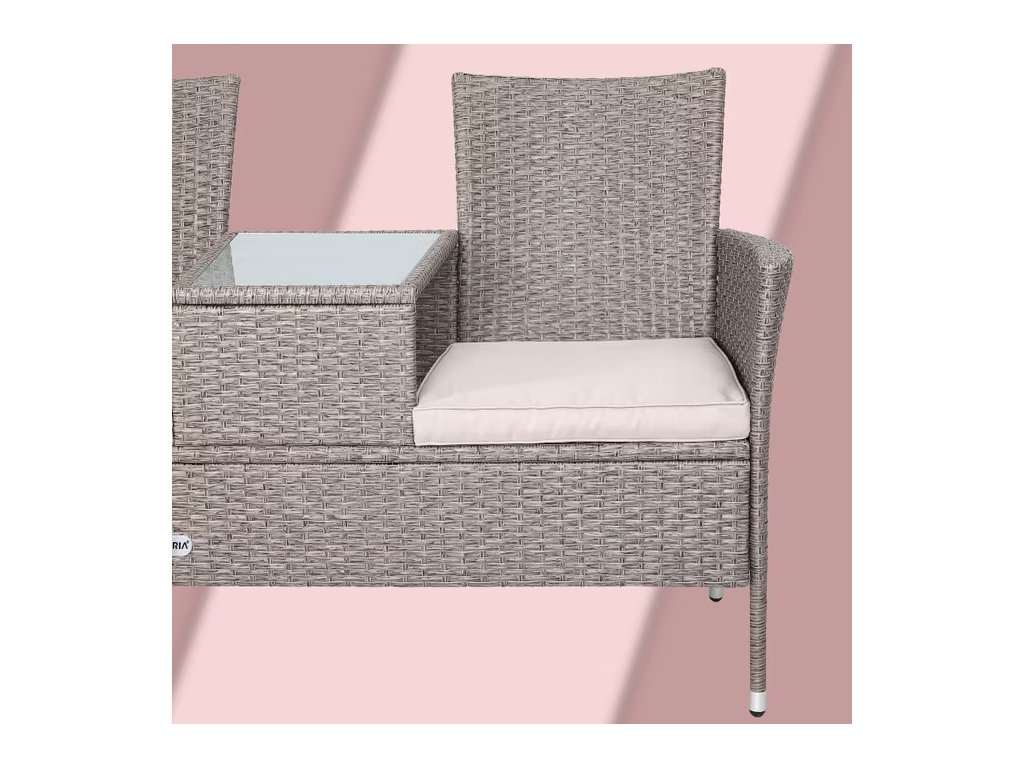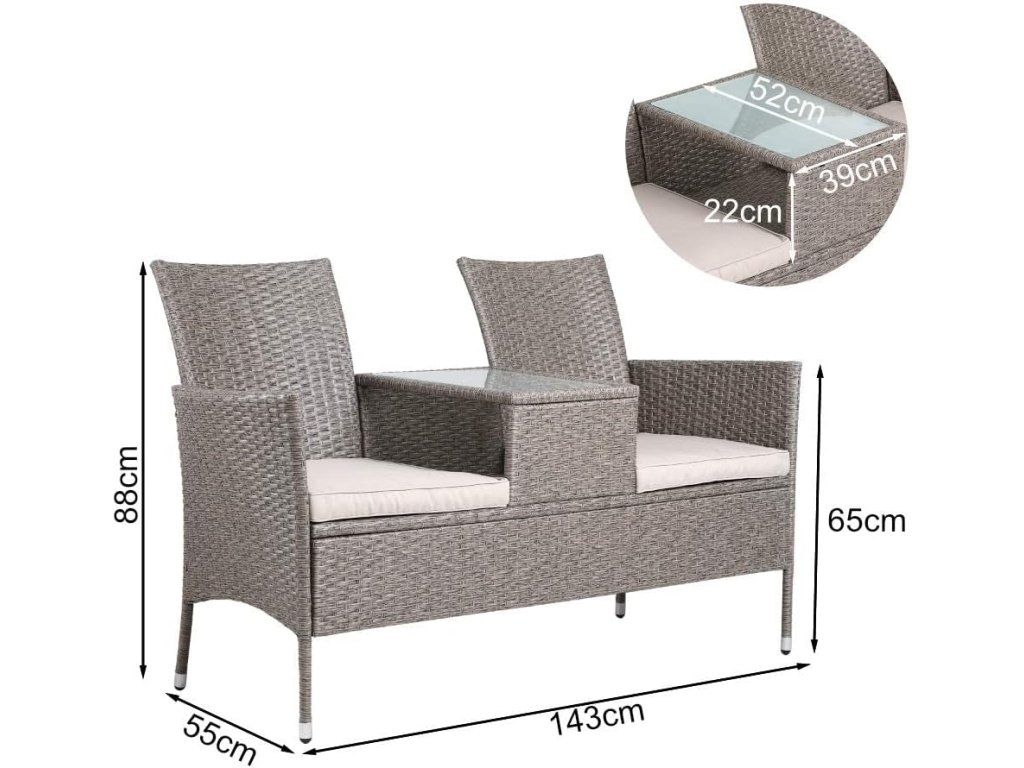 Polyratanová záhradná lavička prináša štýl a eleganciu do vášho vonkajšieho priestoru. S moderným, nadčasovým dizajnom a precíznou, ručne tkanou polyratanovou väzbou vynikne svojím estetickým prevedením. Špeciálnym prvkom je zabudovaný stolík s bezpečnostným sklom v strede lavice. Rám z odolnej ocele s práškovým nástrekom unesie až 160 kg na každú stranu. Podsedáky sú nielen pohodlné, ale aj vodoodpudivé, odnímateľné a ľahko umývateľné. Polyratan, pevné a rovnomerne vinuté plastové vlákno, ktoré bolo špeciálne navrhnuté pre záhradný nábytok. Vyznačuje sa odolnosťou voči poveternostným vplyvom, UV žiareniu, odpudzuje nečistoty a je nenáročný na údržbu.
