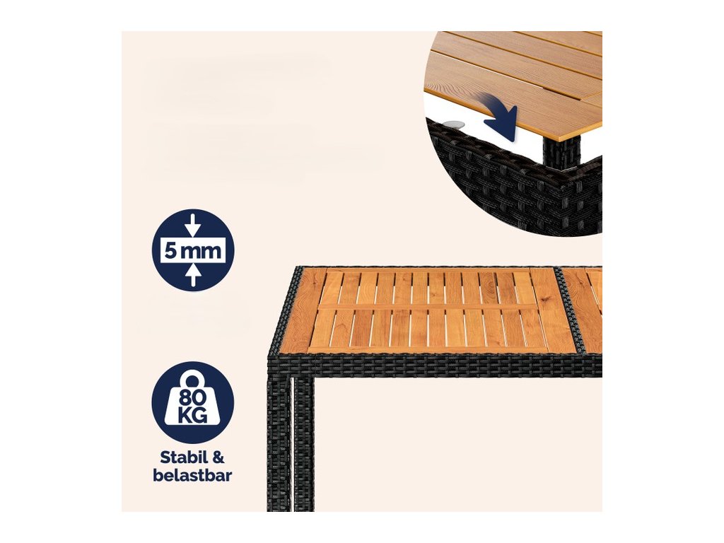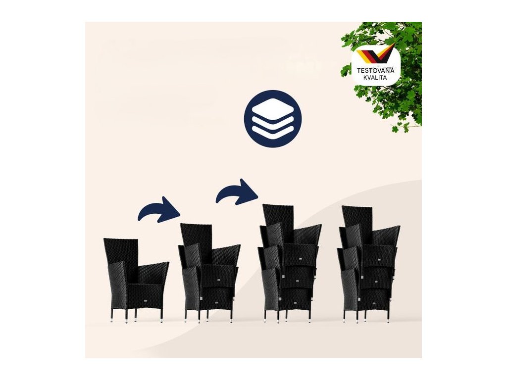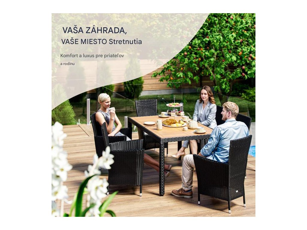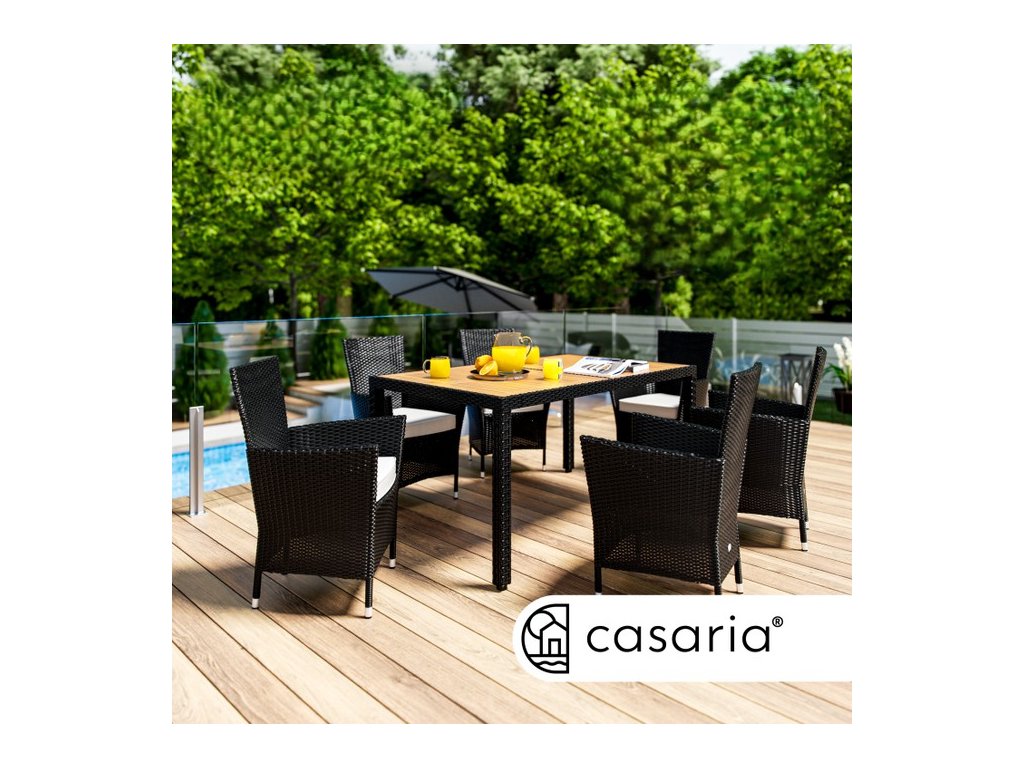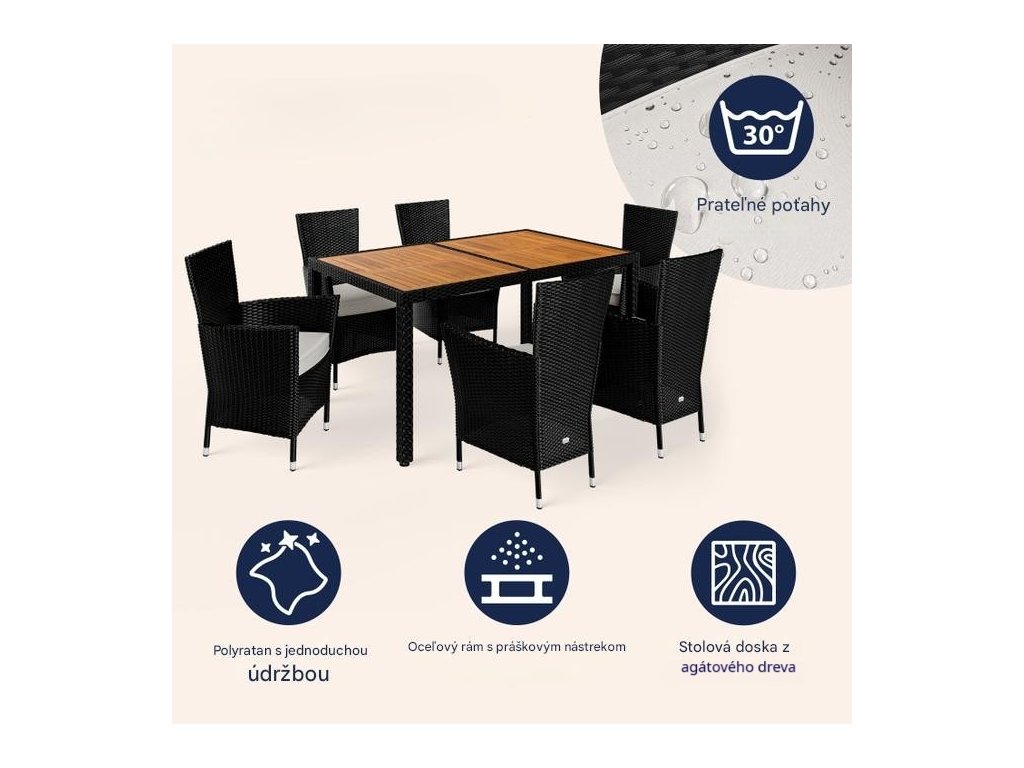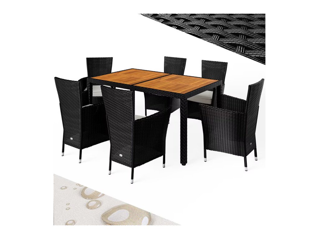 Záhradná zostava z ručne pleteného polyratanu, odolného voči poveternostným podmienkam, obsahuje stôl s rozmermi 150 x 90 x 75 cm a šesť stohovateľných kresiel. Zakrivené opierky rúk, široké operadlá a podsedáky s hrúbkou 7 cm poskytujú maximálny komfort pri sedení. Každé kreslo v zostave unesie až 160 kg a možno ich jednoducho stohovať pre úsporu miesta. Stolová doska z agátového dreva pridáva zostave moderný, prírodne teplý vzhľad, ktorý dokonale zapadne do každej záhradnej oázy.