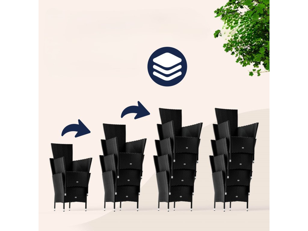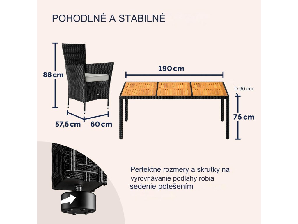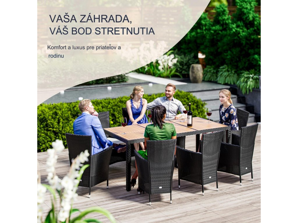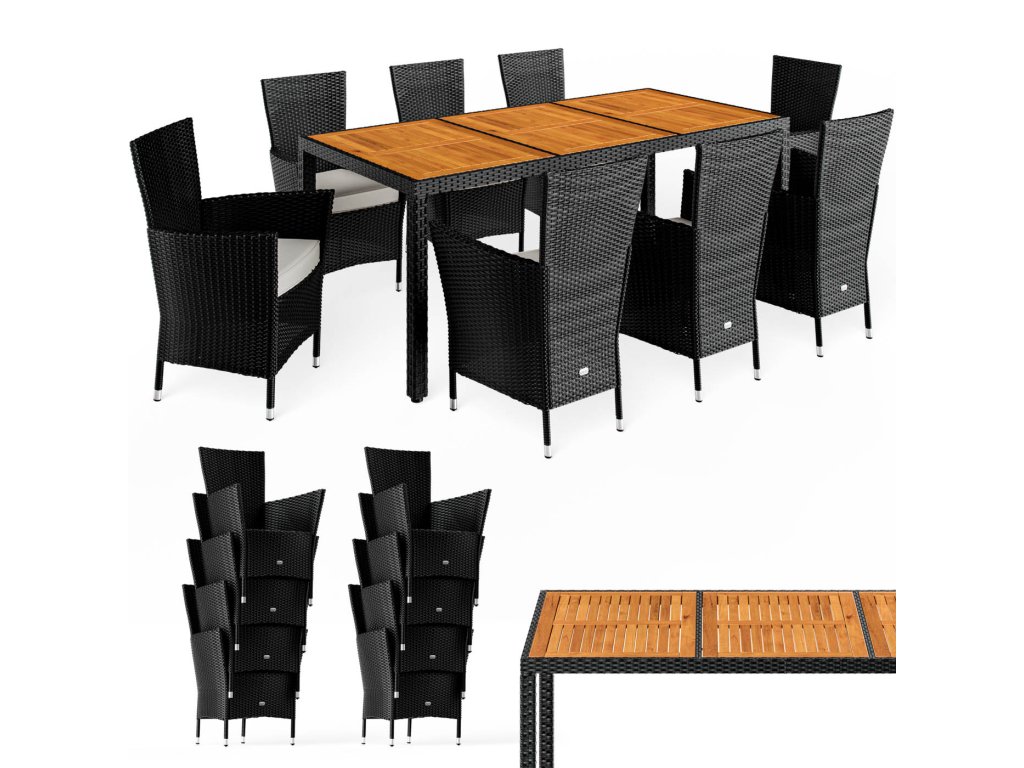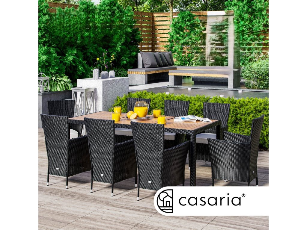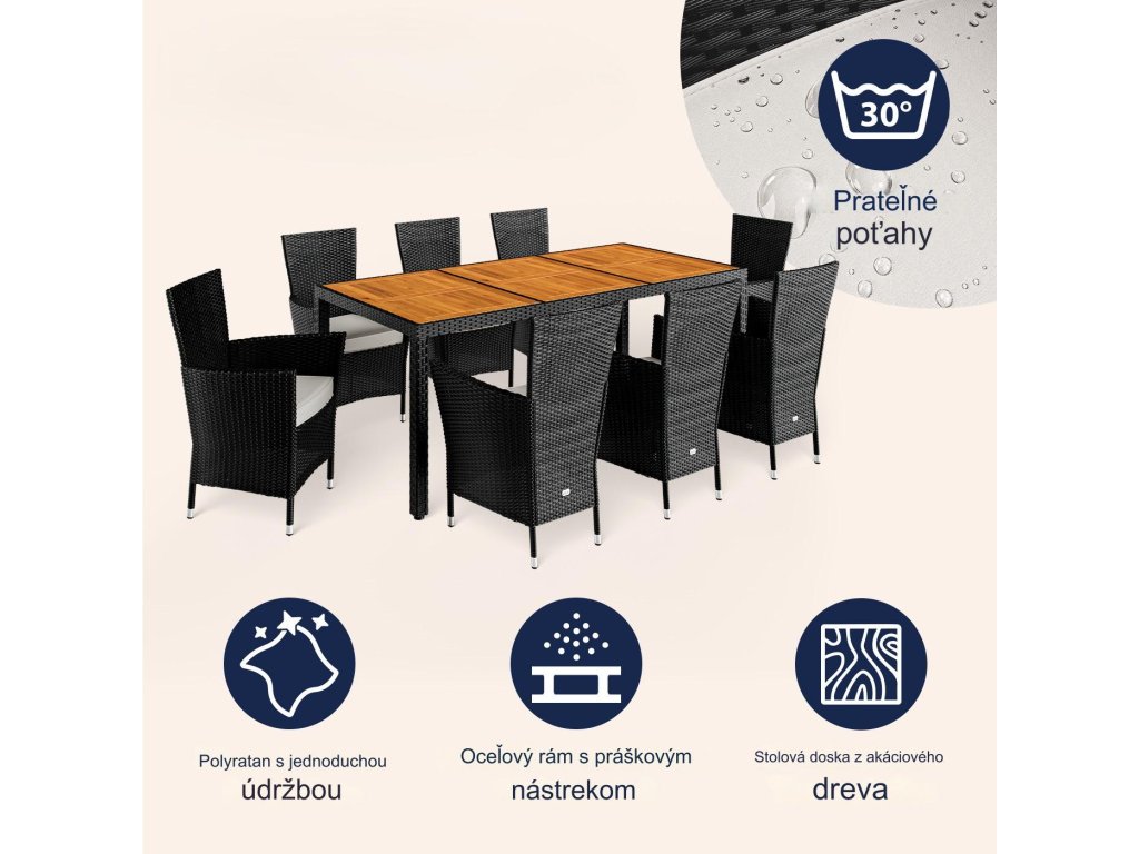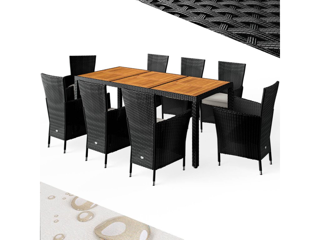 Záhradná zostava z ručne pleteného polyratanu, odolného voči poveternostným podmienkam, obsahuje stôl a osem stohovateľných záhradných kresiel. Zakrivené opierky rúk, široké operadlá a podsedáky s hrúbkou 7 cm poskytujú maximálny komfort pri sedení. Poťahy na podsedákoch sú vodoodpudivé, takže tekutiny nevsakujú okamžite a dajú sa ľahko utrieť. V prípade potreby je možné poťahy vďaka zipsom jednoducho zložiť a oprať pri 30°C. Stolová doska z agátového dreva pridáva zostave moderný, prírodne teplý vzhľad, ktorý dokonale zapadne do každej záhradnej oázy. Nohy stola a kresiel sú vybavené výškovo nastaviteľnými nožičkami, ktoré zabezpečujú stabilitu aj na nerovných povrchoch.