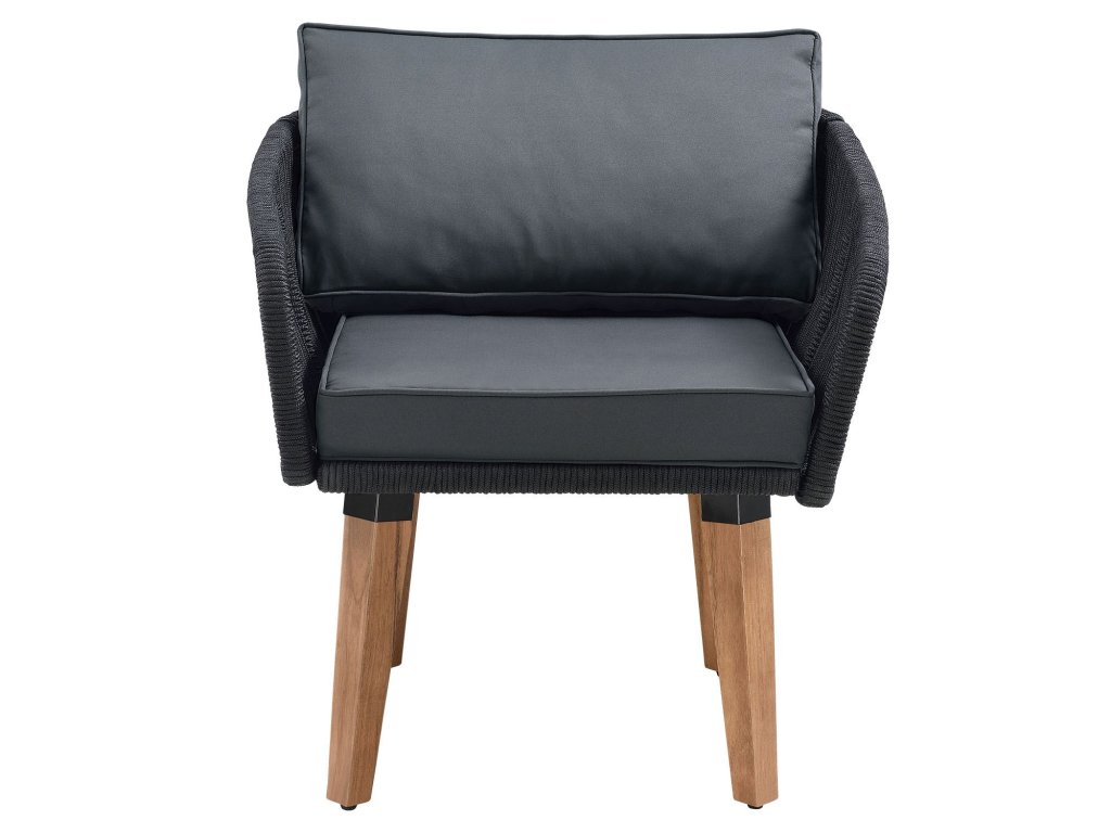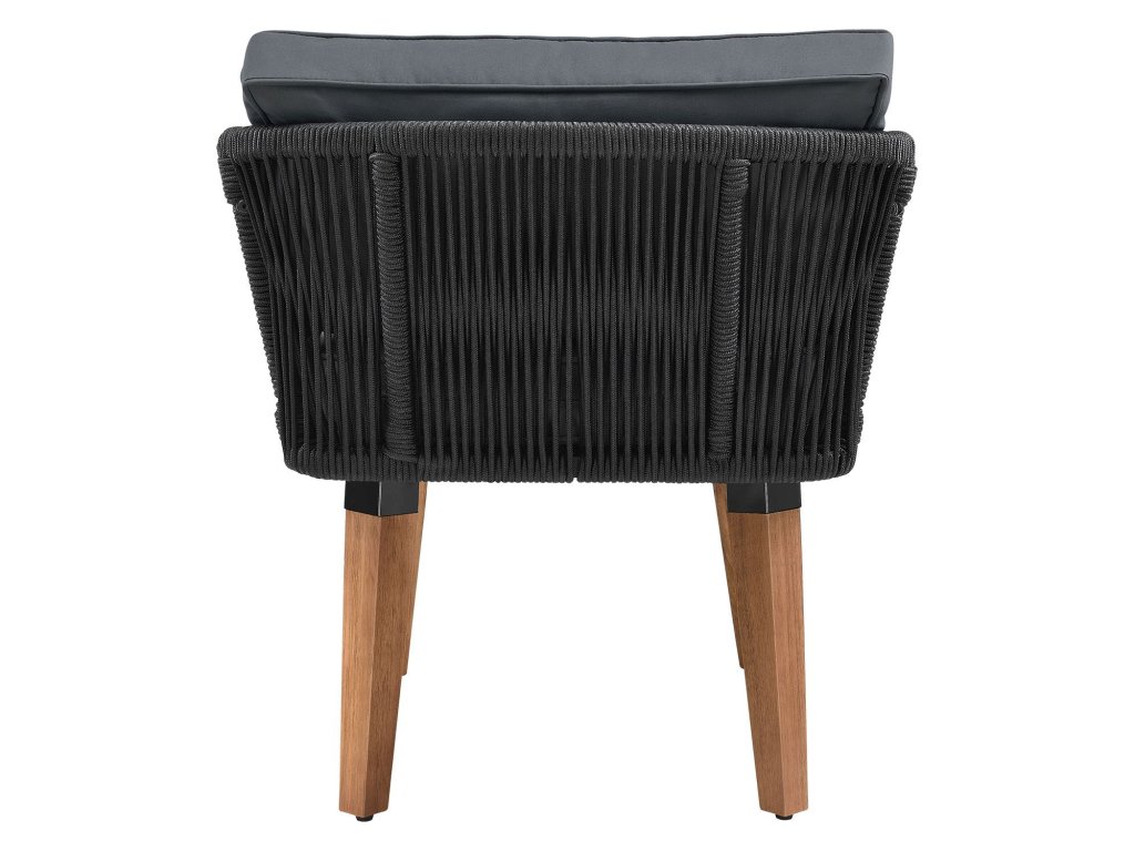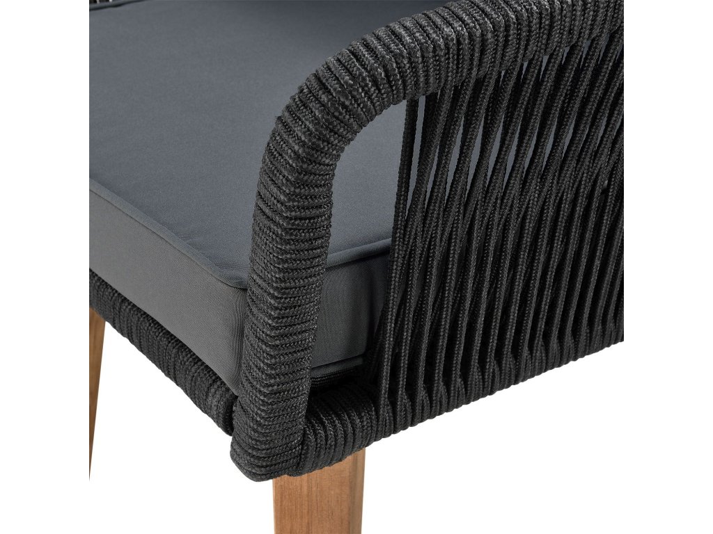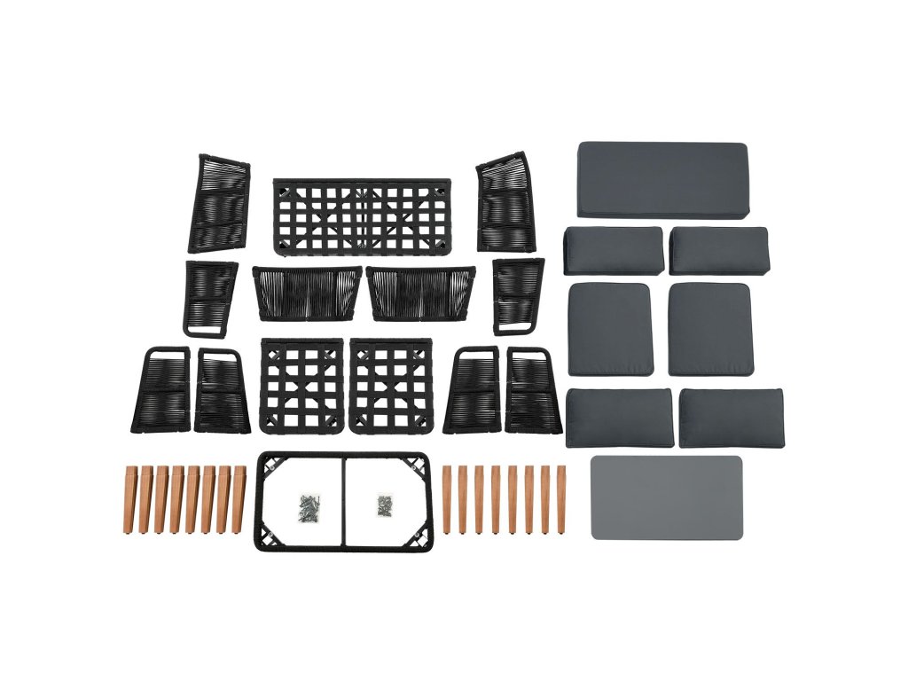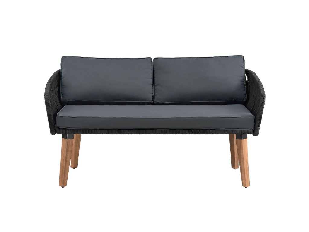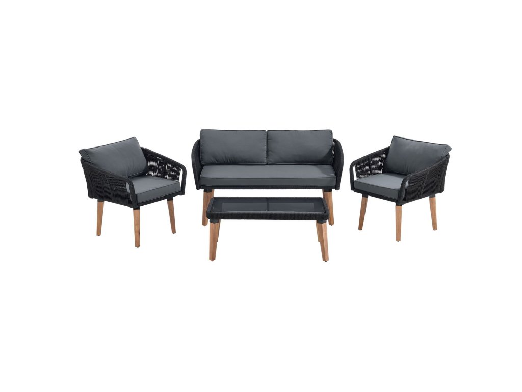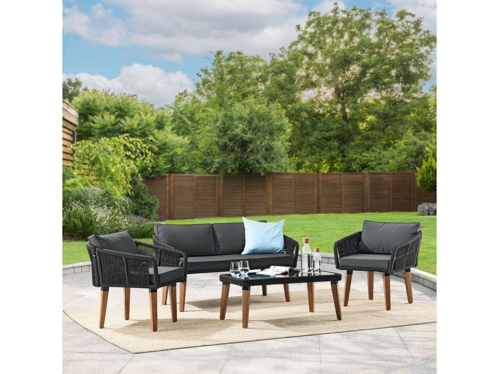 Záhradná zostava Neapol v čiernej farbe so sivými poduškami je štýlovým pútačom. Stabilný kovový rám potiahnutý lanom spolu s nohami z agátového dreva vytvárajú štýlový kontrast. Lano je odolné voči opotrebovaniu, poveternostným vplyvom a UV žiareniu. 4-dielna súprava záhradného nábytku obsahuje dve kreslá, 2-miestnu lavicu a príručný stolík so sklenenou stolovou doskou z tvrdeného skla s hrúbkou 5 mm, vďaka ktorému je platňa odolná voči nárazu a rozbitiu. 3 mäkké podsedáky a 4 chrbtové podušky, ktoré sa prispôsobia telu, zaisťujú pohodlné sedenie. Lakťová opierka a operadlo ponúkajú dodatočné pohodlie. Látkové podušky v šedej farbe sú vodoodpudivé a nenáročné na údržbu. Stačí vyčistiť vlhkou handričkou alebo vyprať v práčke. Na zostave vysokej 45 cm sa pohodlne usadia až 4 osoby.
