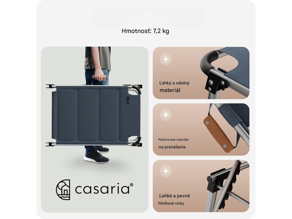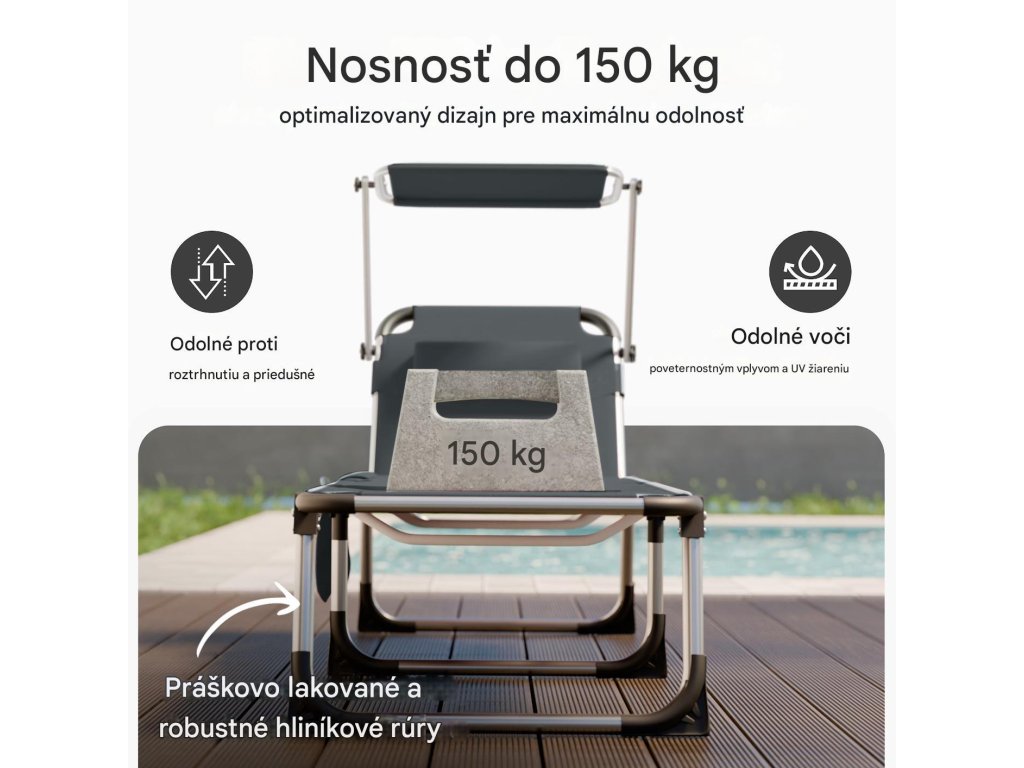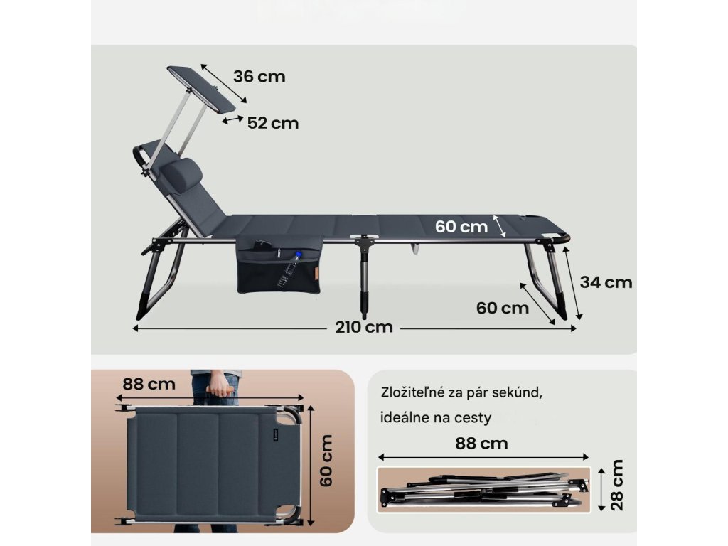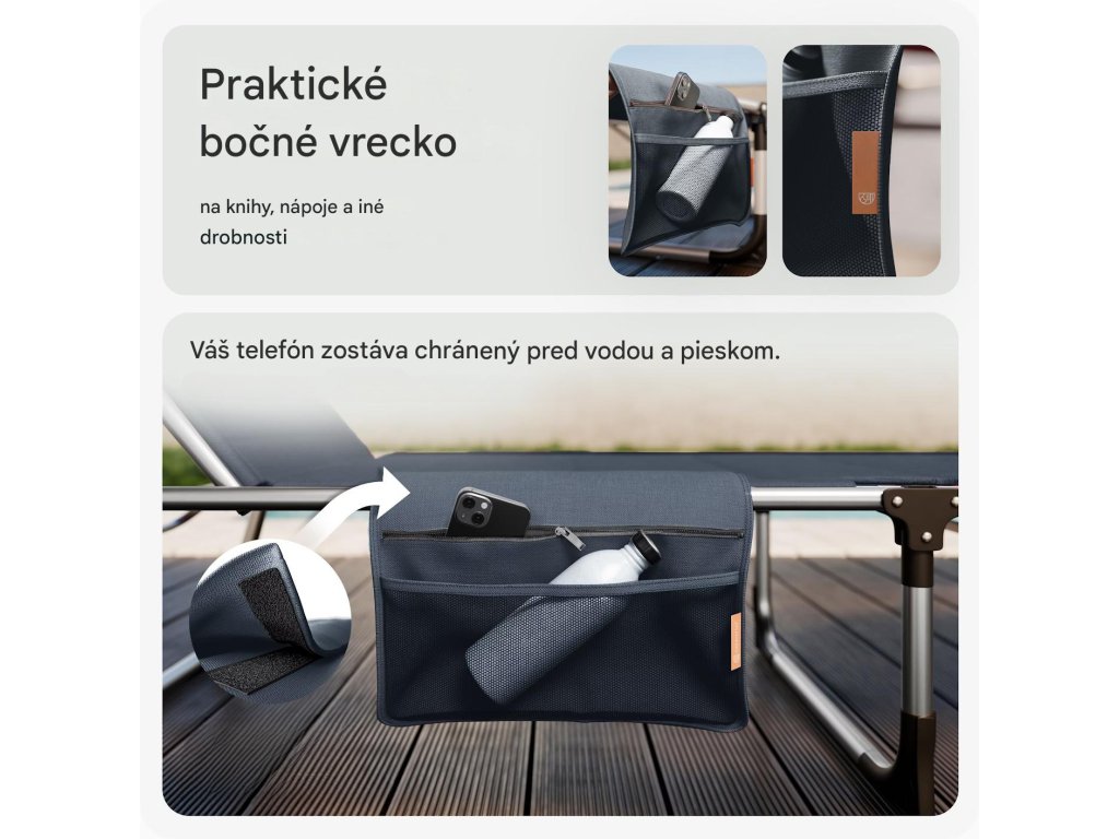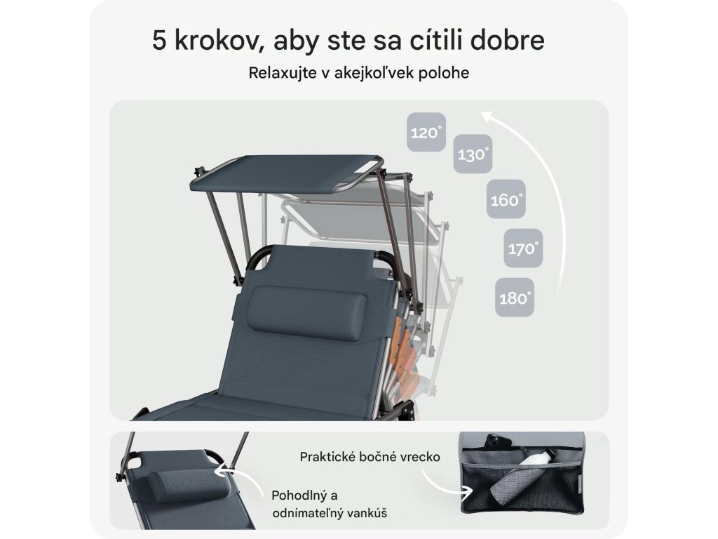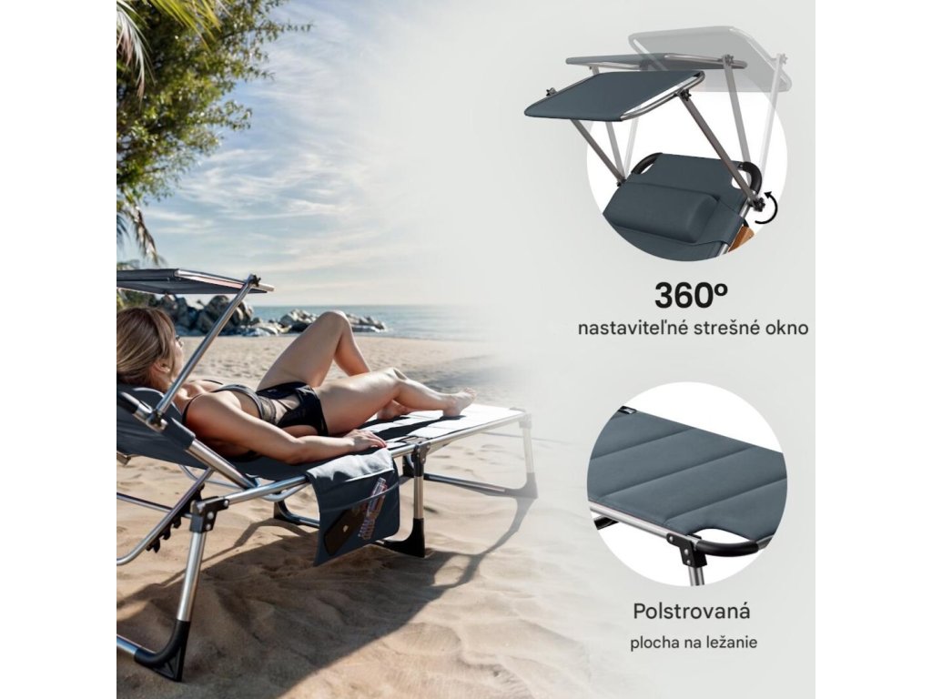 Lehátko ponúka všestranné využitie a ideálne podmienky na relax počas teplých dní doma aj na cestách. Operadlo je možné nastaviť až v 5 rôznych polohách a pohodlná opierka hlavy sa dá individuálne výškovo prispôsobiť. O príjemný tieň sa postará plynule nastaviteľná slnečná clona. Má aj praktické odnímateľné bočné vrecko, do ktorého si môžete uložiť nápoj, slnečné okuliare alebo telefón. Poťah z odolného materiálu je priedušný, vodeodolný, nenáročný na údržbu a odolný voči UV žiareniu.Vďaka skladacej konštrukcii je možné lehátko rýchlo zložiť, čím sa šetrí priestor pri skladovaní aj preprave. Rukoväte potiahnuté mäkkou PU kožou zabezpečujú pohodlné prenášanie. Všetky spoje sú zosilnené a látka je pevne zapustená do rámu, čo zaručuje stabilitu, dlhú životnosť a moderný vzhľad.Výhody produktu:
