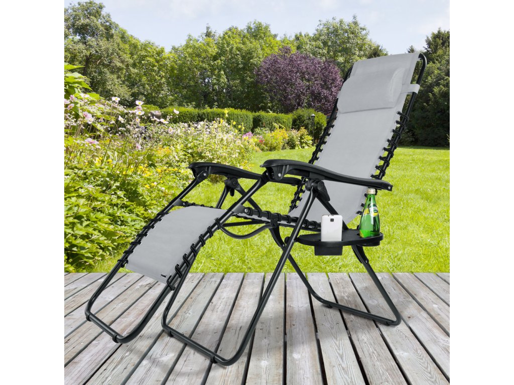 Toto kreslo je ideálne do záhrady, na terasu alebo balkóna. Vďaka polohovateľnej opierke chrbta nájdete vždy tú správnu polohu – či už na čítanie, opaľovanie alebo relax. Kvalitný polyesterový sieťovaný poťah s podhlavníkom je pripevnený k robustnej rúrkovej oceľovej konštrukcii pružným popruhom a ponúka dokonalé prispôsobenie telu. Vďaka malému stolíku, ktorý sa dá behom chvíľky pripevniť na bok, máte svoj smartfón, chladený nápoj alebo obľúbenú knihu vždy po ruke. Rúrkový oceľový rám s pevným práškovým nástrekom v modernom tepanom vzhľade vyzerá dobre a robí kreslo odolnejšie voči poveternostným vplyvom.