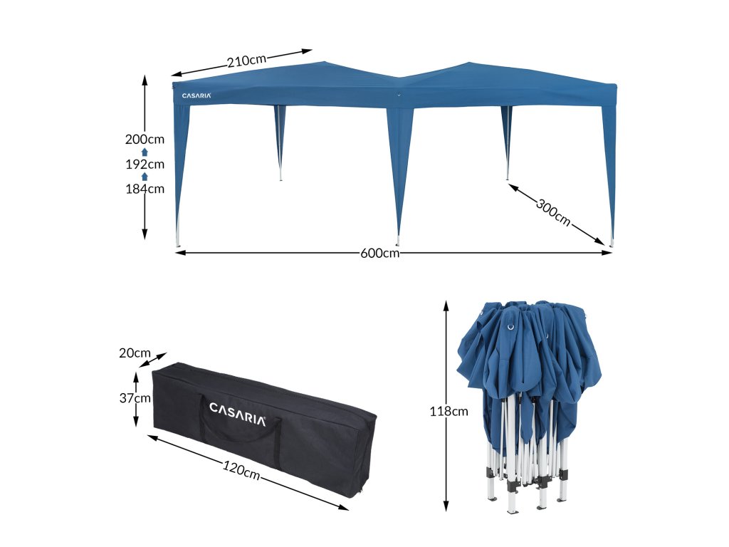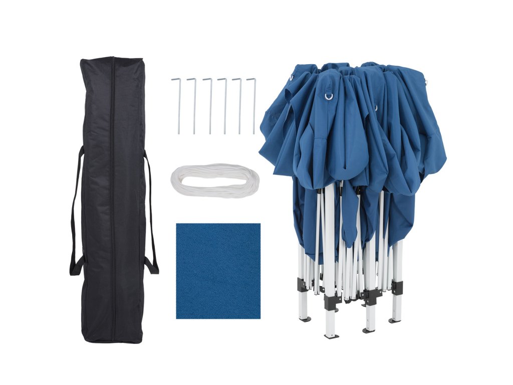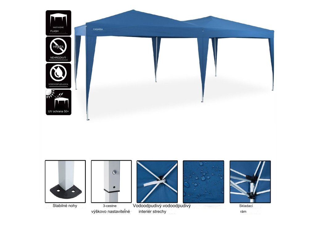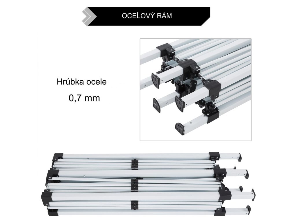 Vďaka praktickému skladaciemu systému je možné altánok kompletne zložiť v niekoľkých krokoch. Kovové vzpery a ukotvovacie nohy dodávajú altánku stabilnú konštrukciu. Oceľové rúrky majú hrúbku 0,7 mm. Strešná krytina je vyrobená z vodoodpudivého polyesteru s PA náterom. Poťah má UV ochranu pred slnkom 50+. Výškovo je možné altánok nastaviť 3-krát pomocou nožných výstuh: 184 - 192 - 200 cm. Bleskovo zložíte a uložíte do prenosnej tašky Oxford 600 D, aby ste ušetrili miesto.