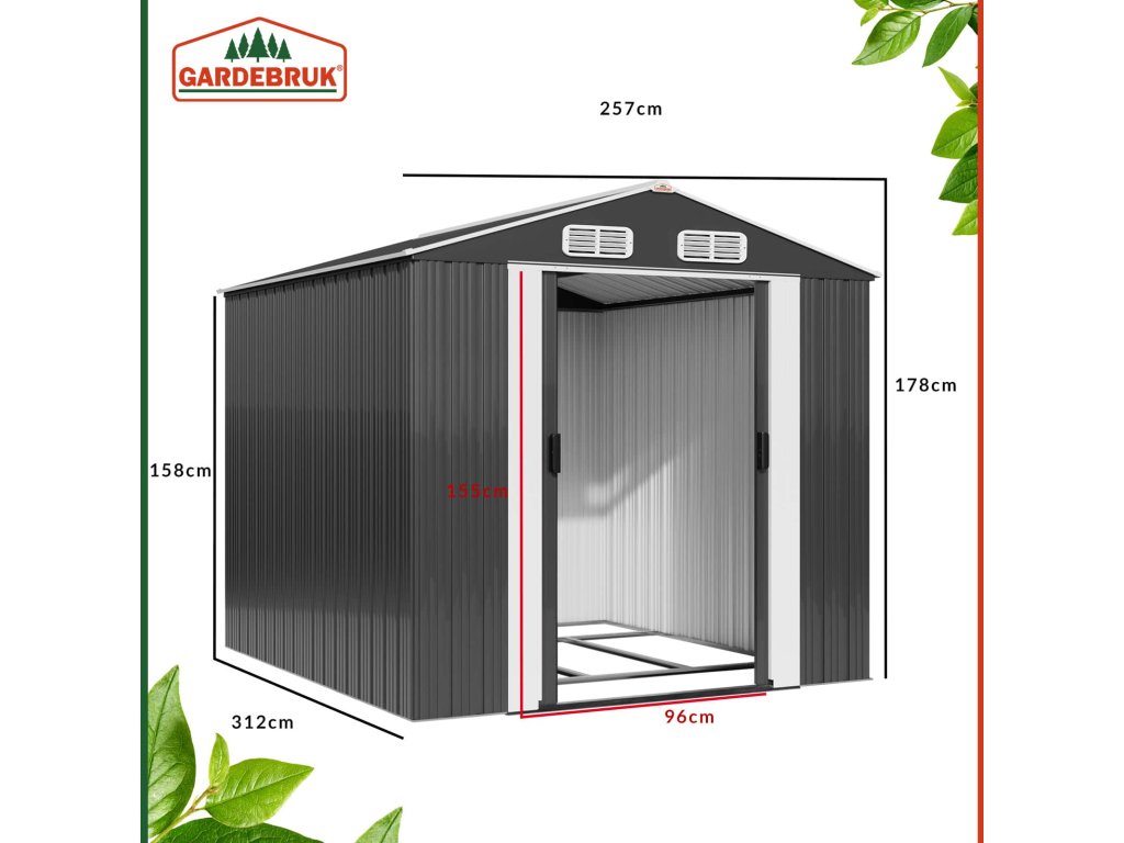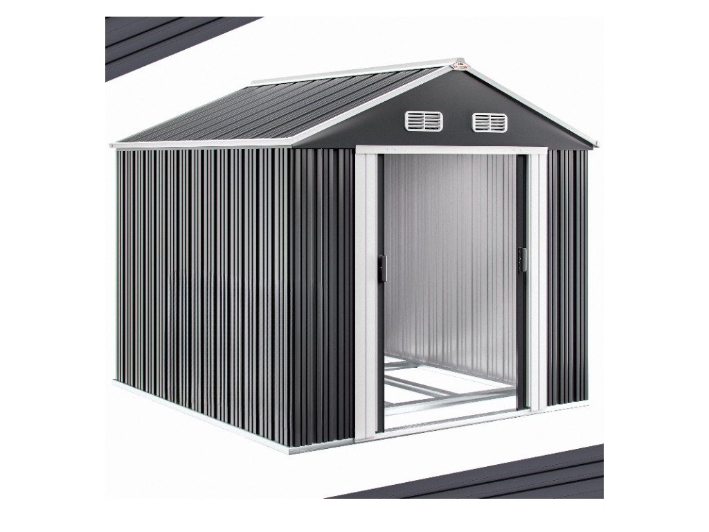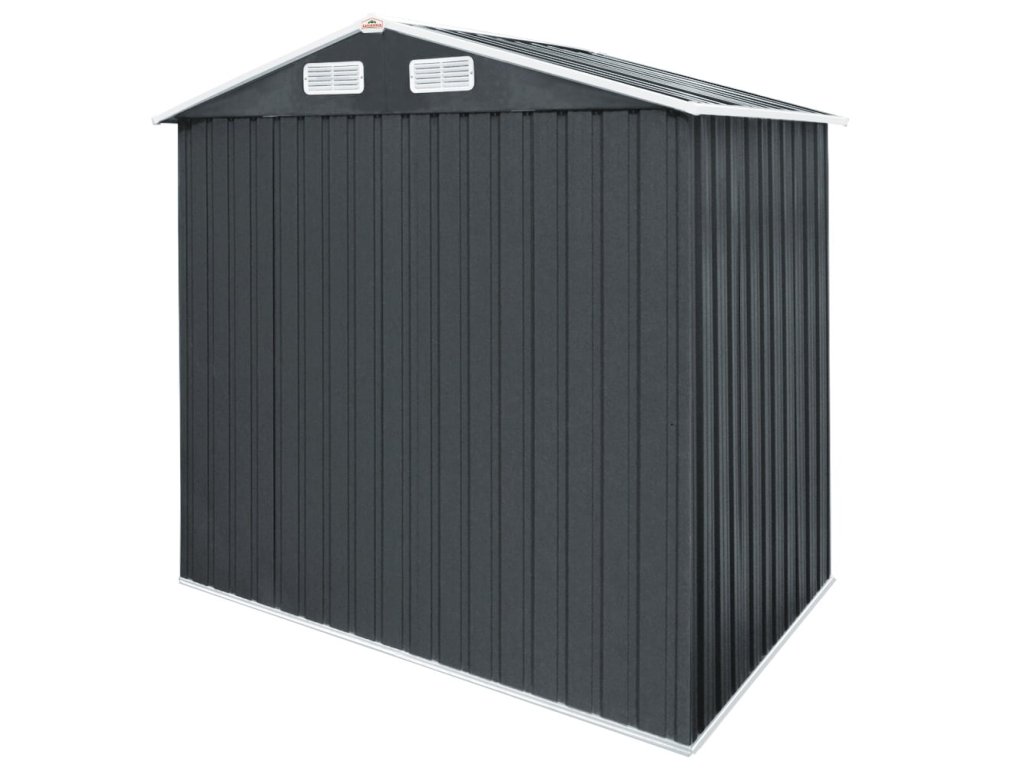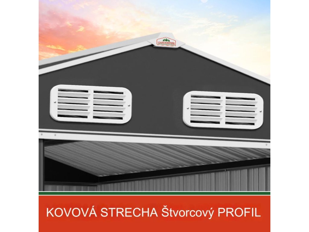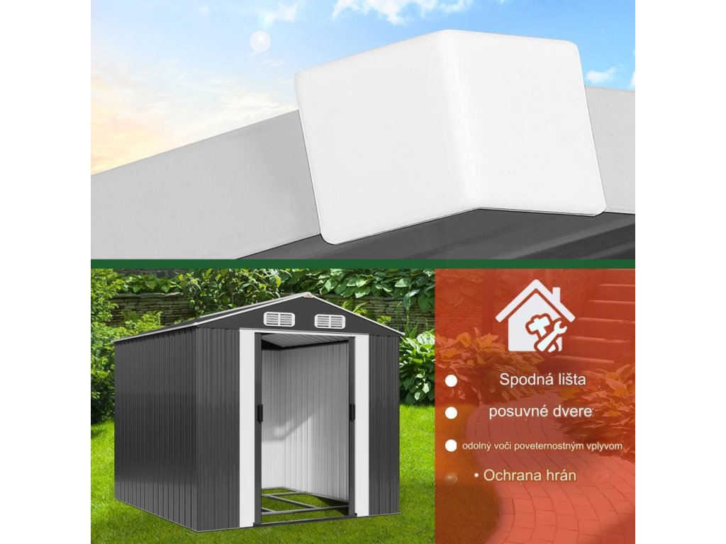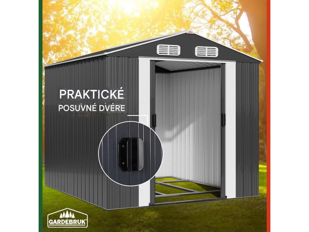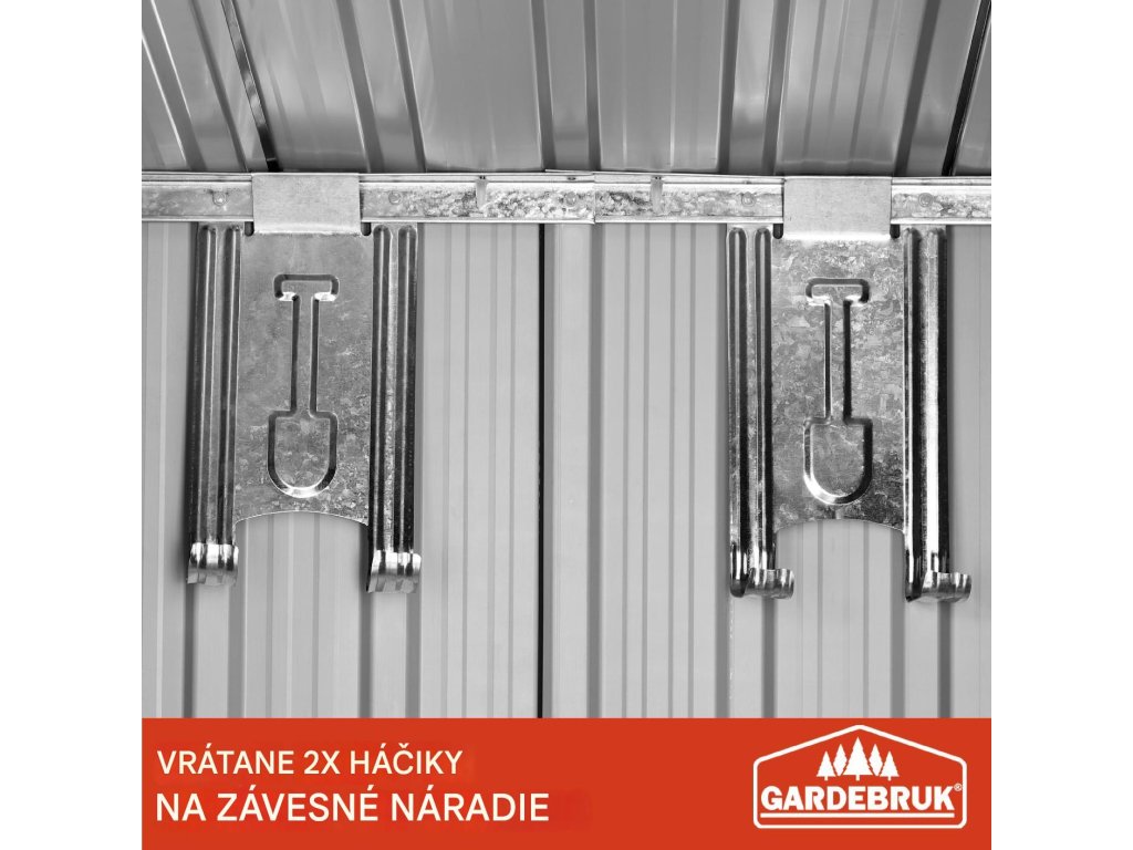 Pozinkovaný podlahový rám umožňuje aj montáž drevenej podlahy. Záhradný domček ponúka priestor pre bicykle, náradie a iné záhradné potreby. Má tiež dvojdielne posuvné dvere, 4 vetracie otvory v hornej časti (2 vpredu a vzadu) a dodáva sa so základnou lištou. Rohy plechovej strechy sú navyše opatrené ochranou hrán .