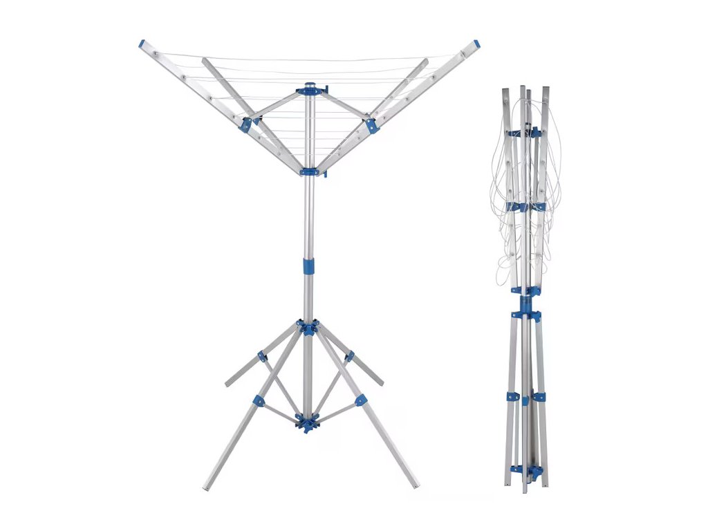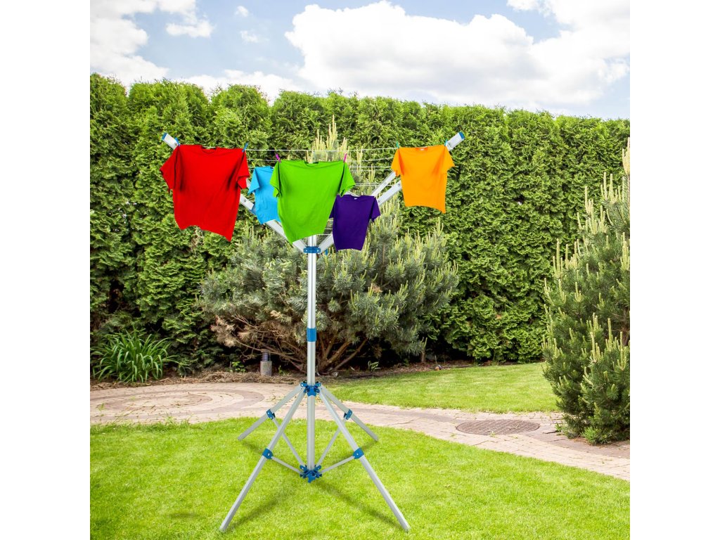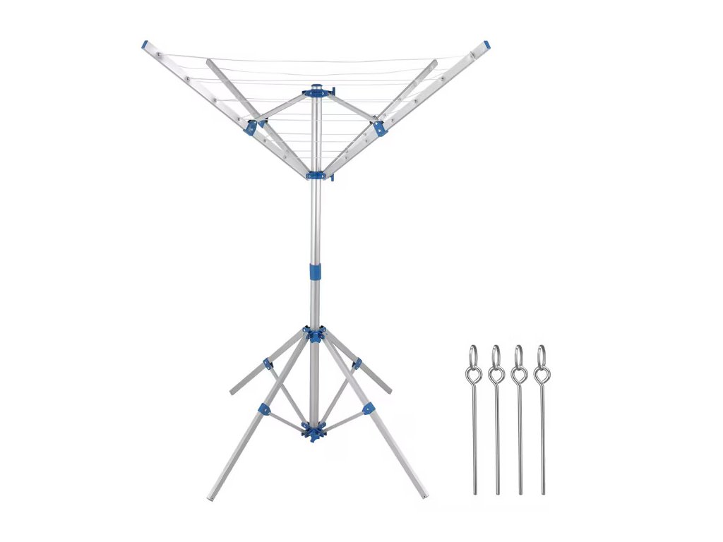 Rotačný sušiak na bielizeň s dĺžkou linky 14m sa skladá z 2 častí, ktoré sa dajú rýchlo a jednoducho zložiť. Skladací hliníkový rám je nastaviteľný, preto si rotačný sušiak môžete prispôsobiť svojim individuálnym potrebám. Je odolná voči poveternostným vplyvom a ponúka dostatok priestoru pre všetky druhy bielizne a stojí na 4 pevných hliníkových nožičkách. Ak chcete umiestniť rotačný sušiak na bielizeň na trávnik, priložené 4 pozemné kolíky vám pomôžu pripevniť nohy.
