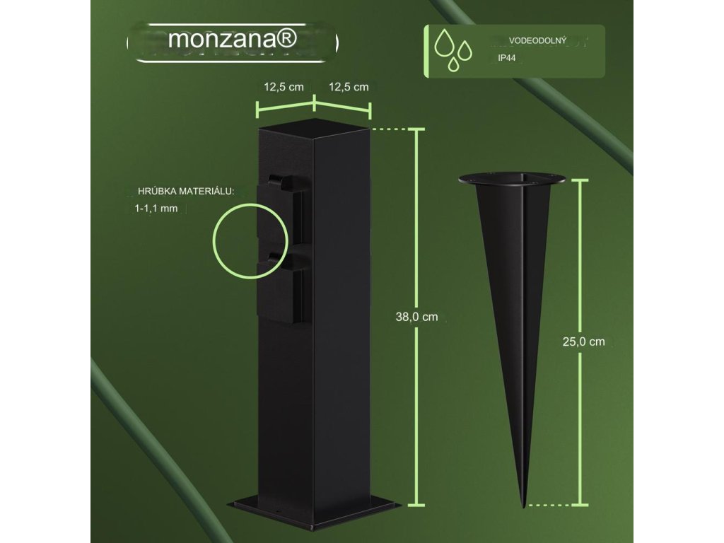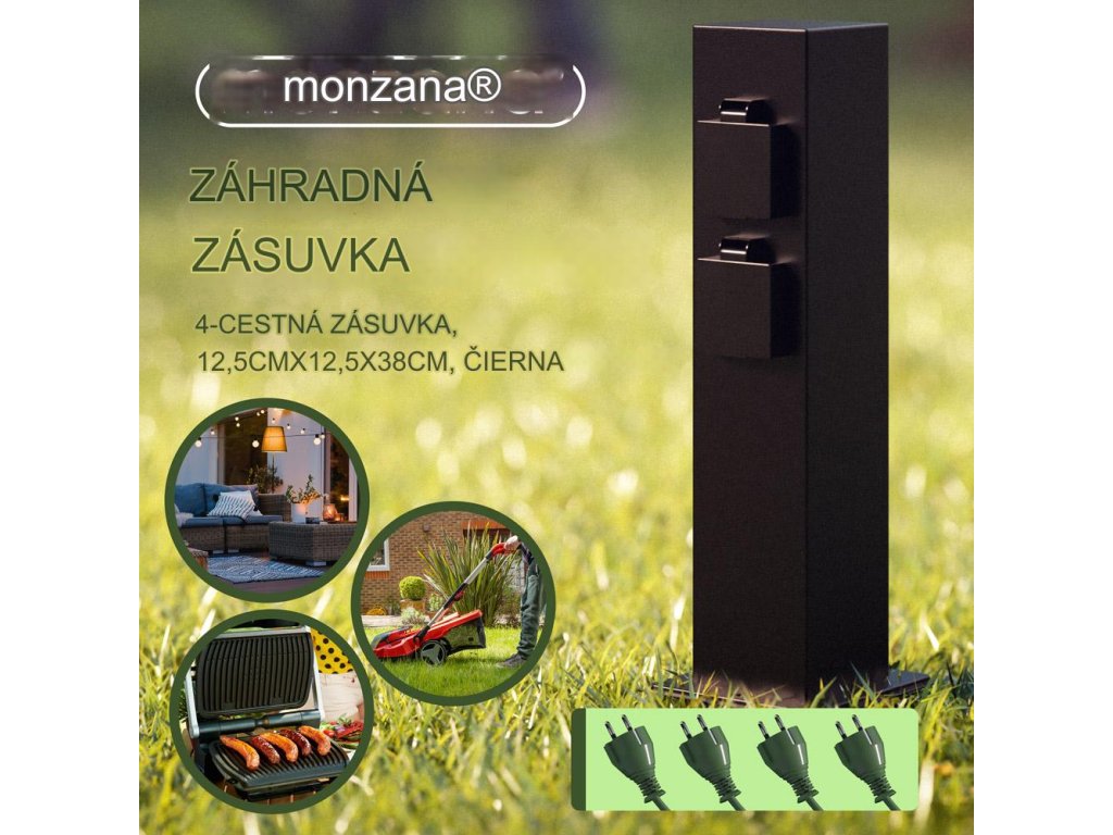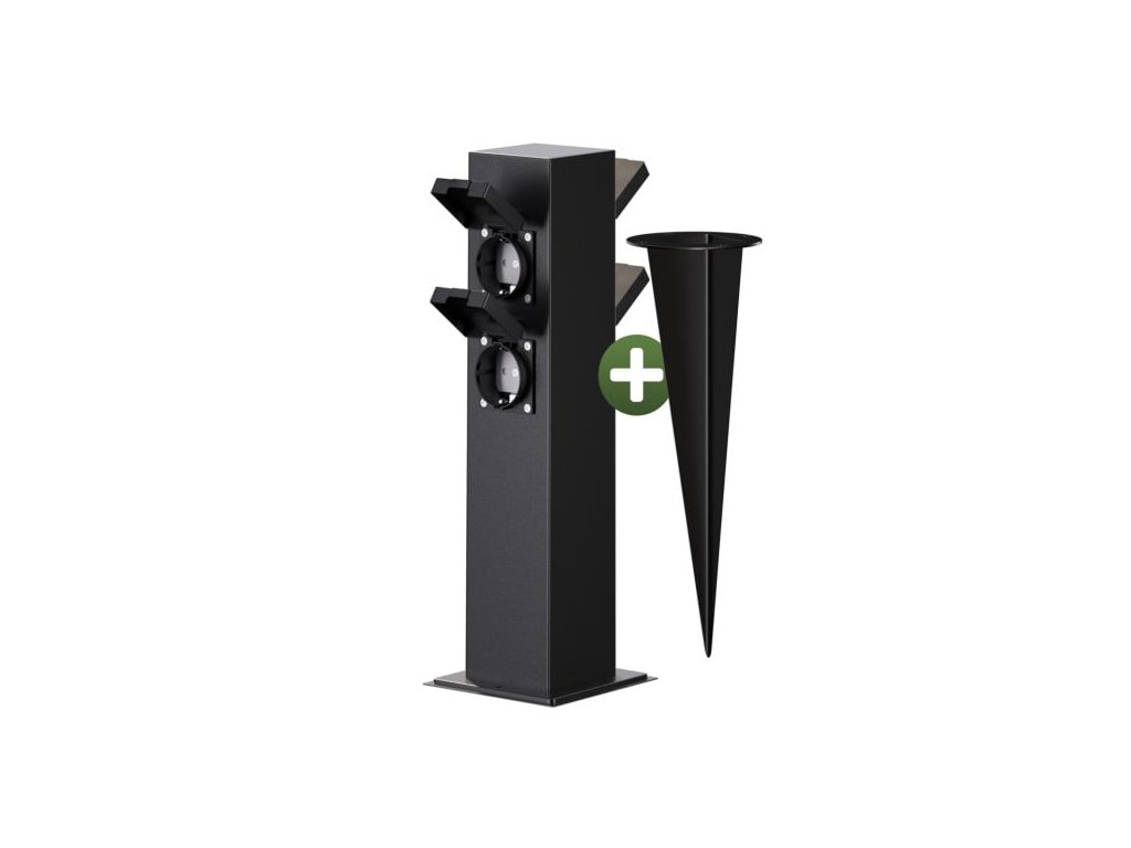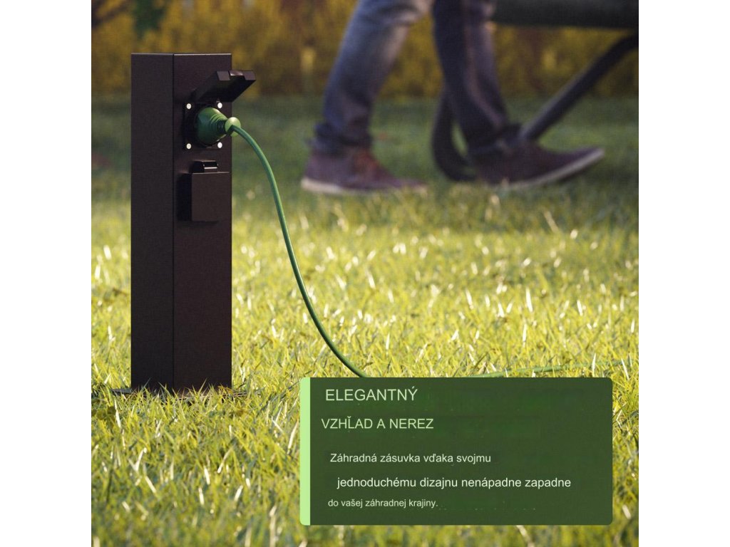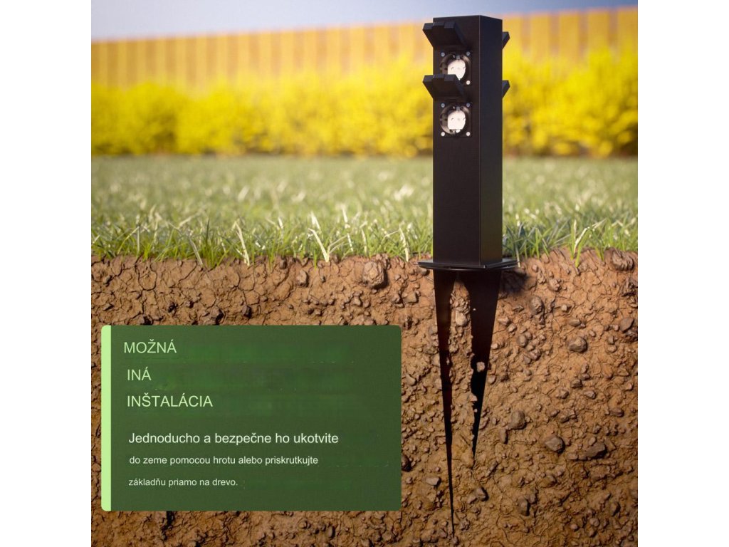 Stĺpik možno všestranne použiť či už na osvetlenie záhradnej párty, vianočné osvetlenie, na kosenie trávnika alebo na zapojenie elektrického grilu. S viacnásobnou zásuvkou môžete napájať niekoľko vonkajších zariadení súčasne. Je vyrobená z vysoko kvalitnej nehrdzavejúcej ocele s čiernym práškovým nástrekom. Montáž záhradného stĺpiku je veľmi jednoduchá, buď je ukotvená do zeme pomocou zemného hrotu alebo priskrutkovaná priamo k drevenej základni.
